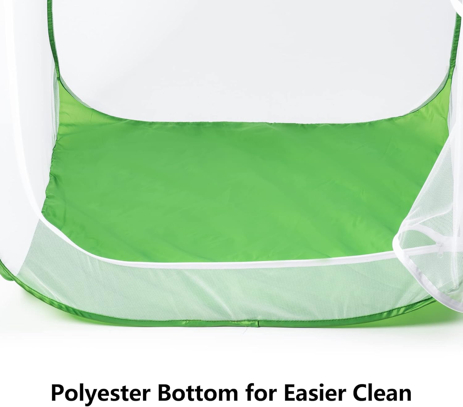 - Coarser mesh material for durable use. Polyester Bottom for Easier Clean. Assembles instantly, no tools needed, just slip off the elastic strap from around the circle, the cage can pop open.