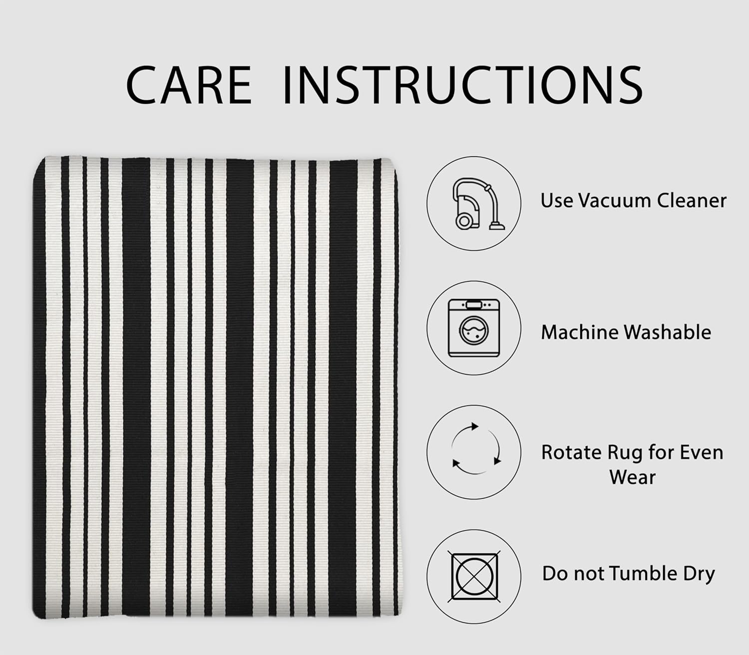 - Easy to Clean: This black and white striped rug is simple to maintain with machine wash or vacuuming to remove dirt. The rug is sturdy and can be tumble dried on low. Keep your door rug fresh and clean with minimal effort. NOTE: Cotton rugs normally shrink slightly after washing