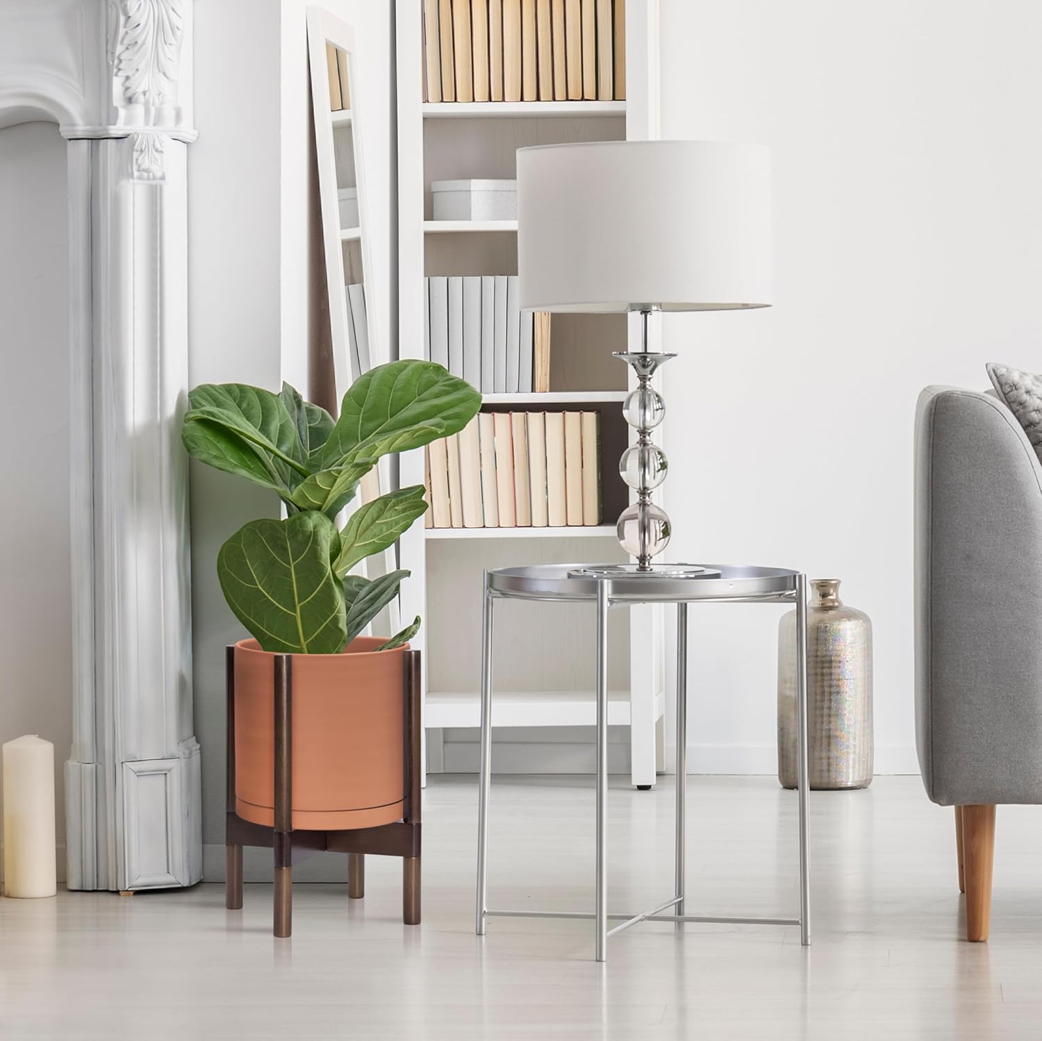 D'vine Dev Terracotta Planter with Walnut Color Stand - 10 Inch Modern Round Flower Pot with Wood Planter Holder, Terracotta, 55-B-X-5