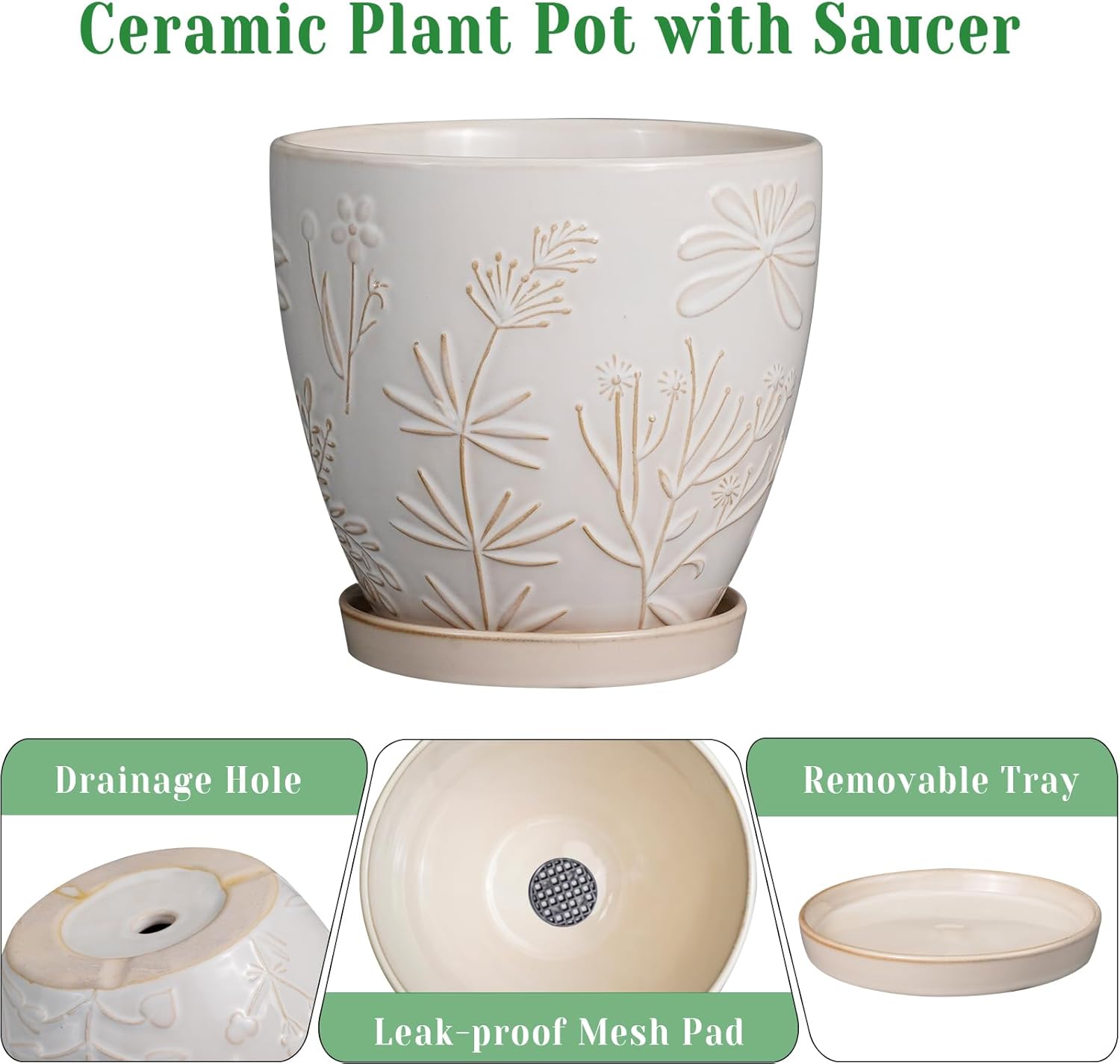 - Stylish Appearance: Our ceramic plant pot has a white main colour, a beautiful embossed petal and leaf pattern on the surface, elegant appearance making it ideal for home decor, garden decor and office decor