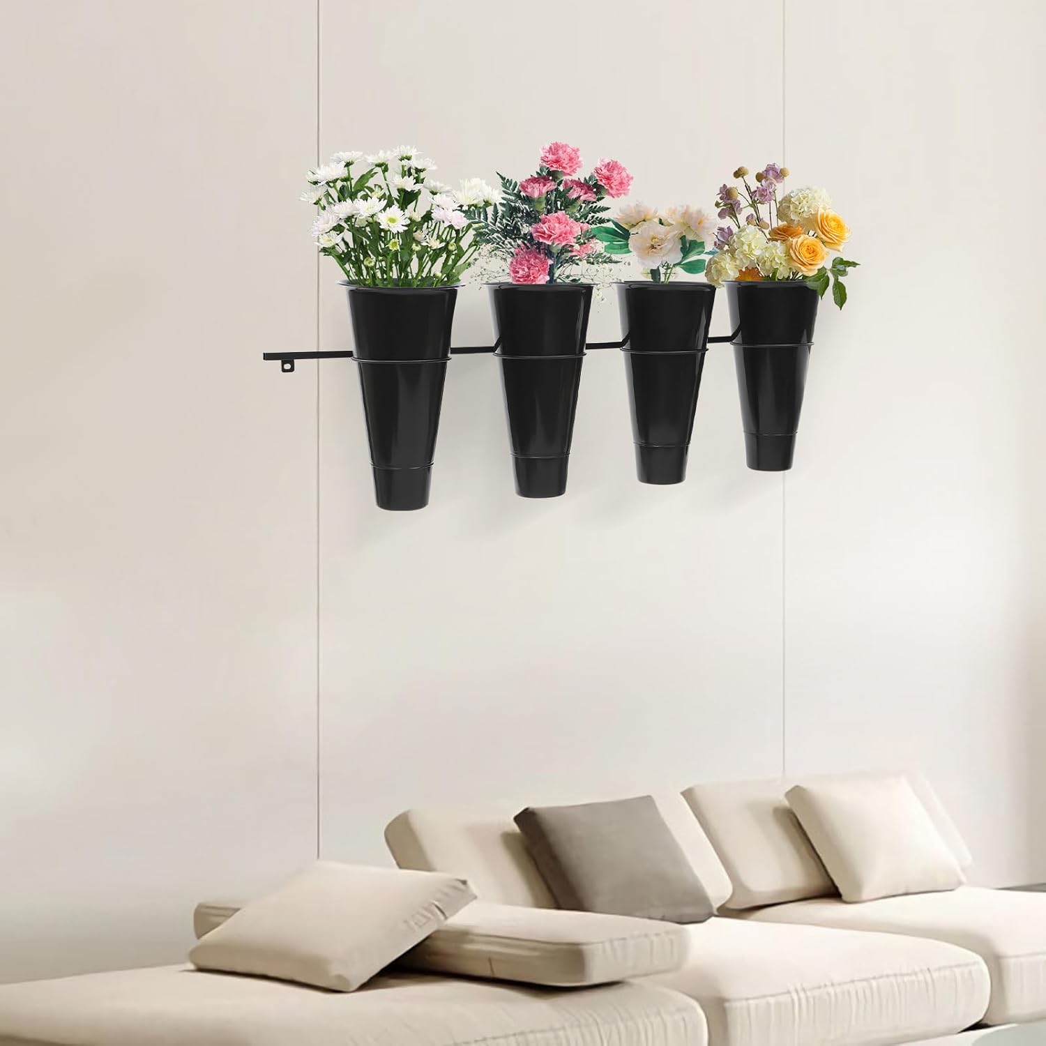 Wall Mounted Plant Holder with 4 Buckets,Metal Flower Pot Wall Hanging Shelf Black Indoor Outdoor Decorative Floating Shelves Planter Hanger Racks for Wall Bedroom Living Room Porch
