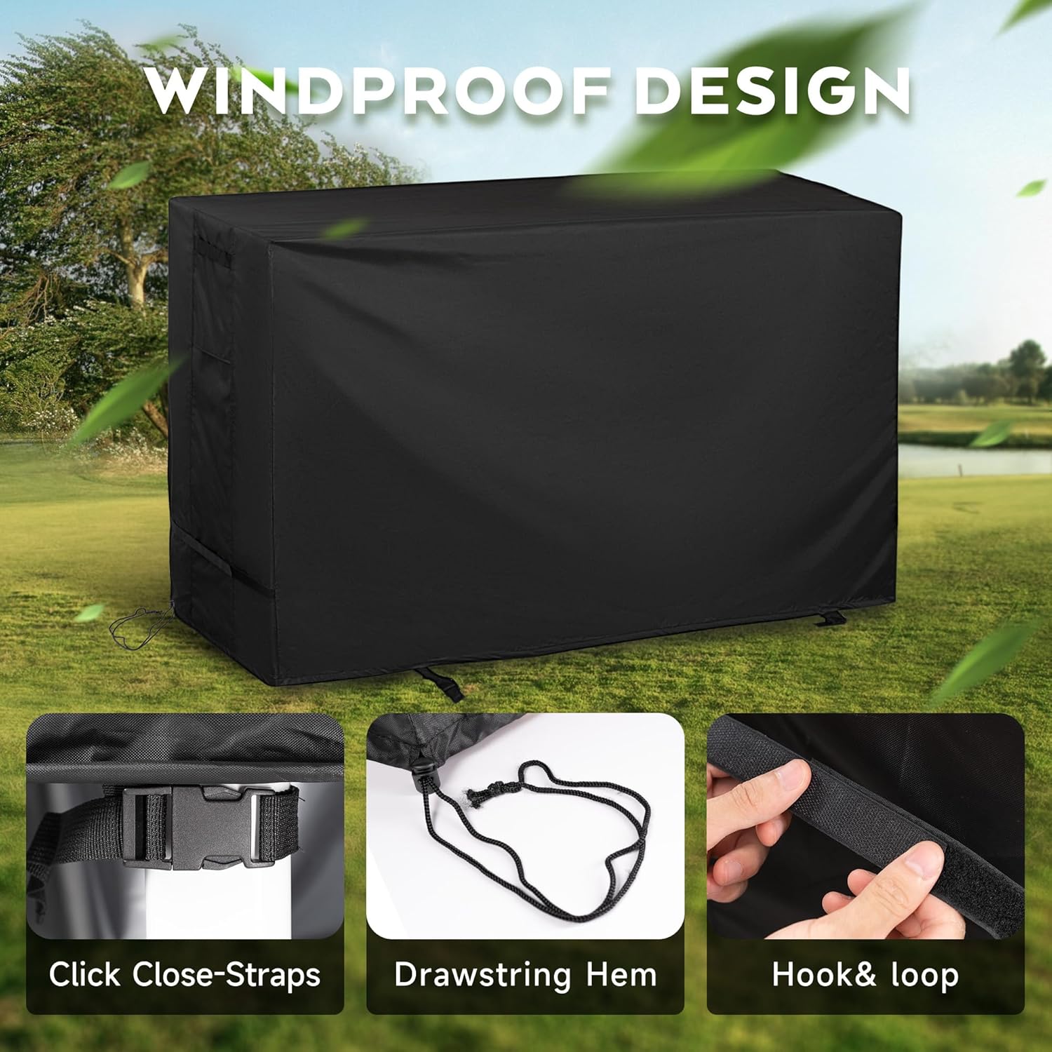 - FIT & SECURE β Drawstring and click close-straps allow you to easily adjust the outdoor table cover for a tight and custom-like fit. Four buckles can keep the cover in place and prevent the cover from being blown off on windy days