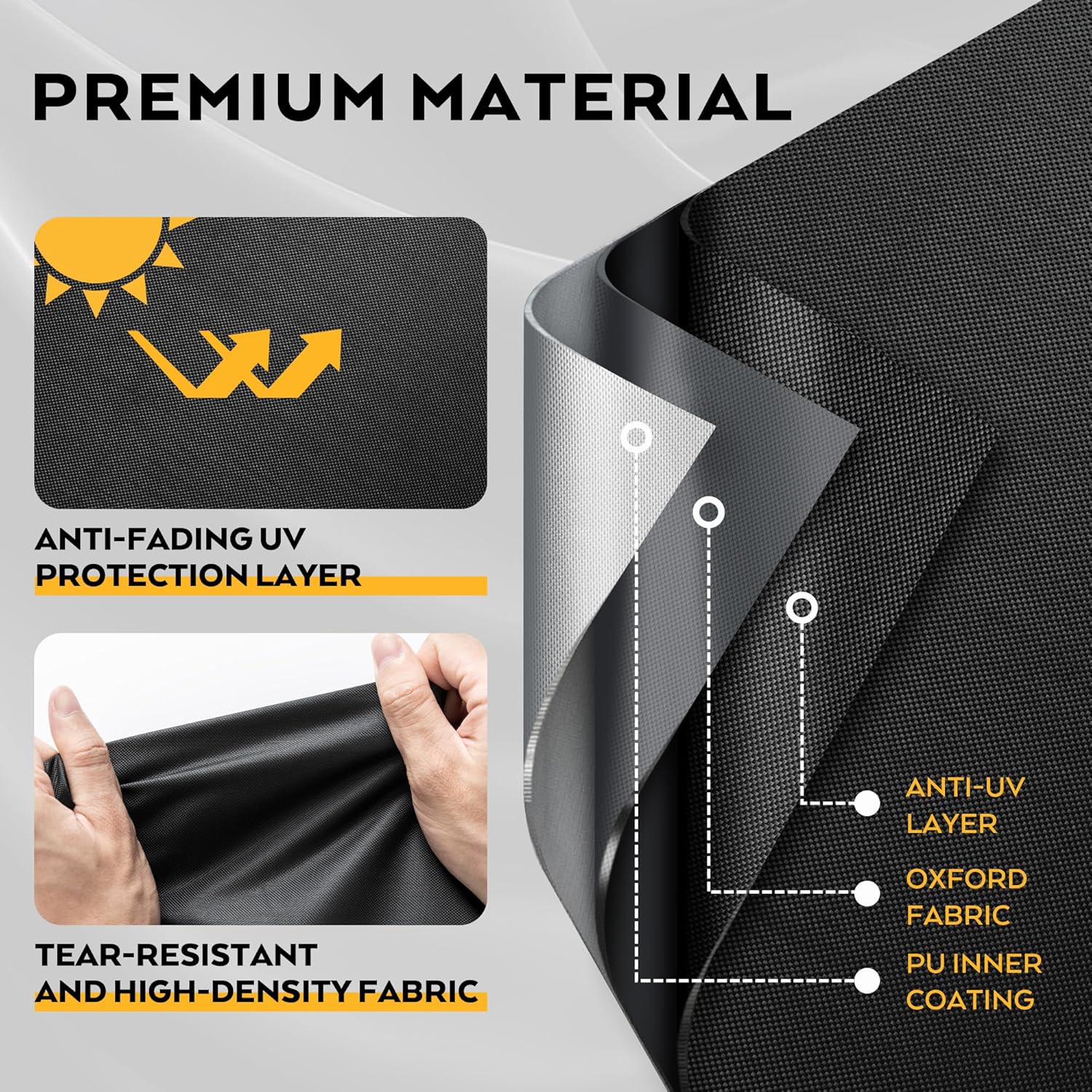 - ANTI-TEAR MATERIAL β Designed to be long lasting, this outdoor table cover is made of high-density 420D oxford fabric with reinforced stitching, which is lightweight but durable materials that can withstand harsh weather conditions and resist tearing, fading, and other types of damage