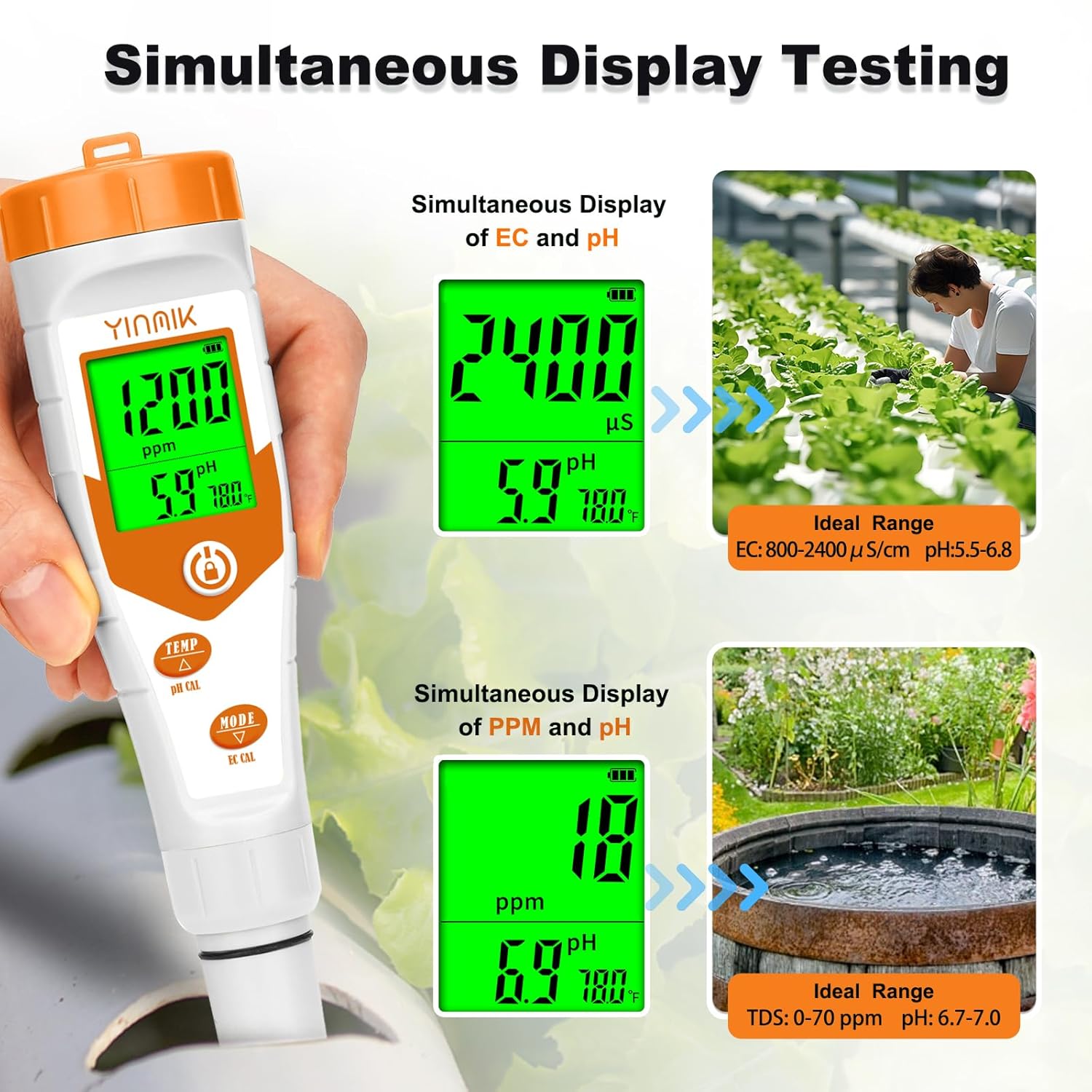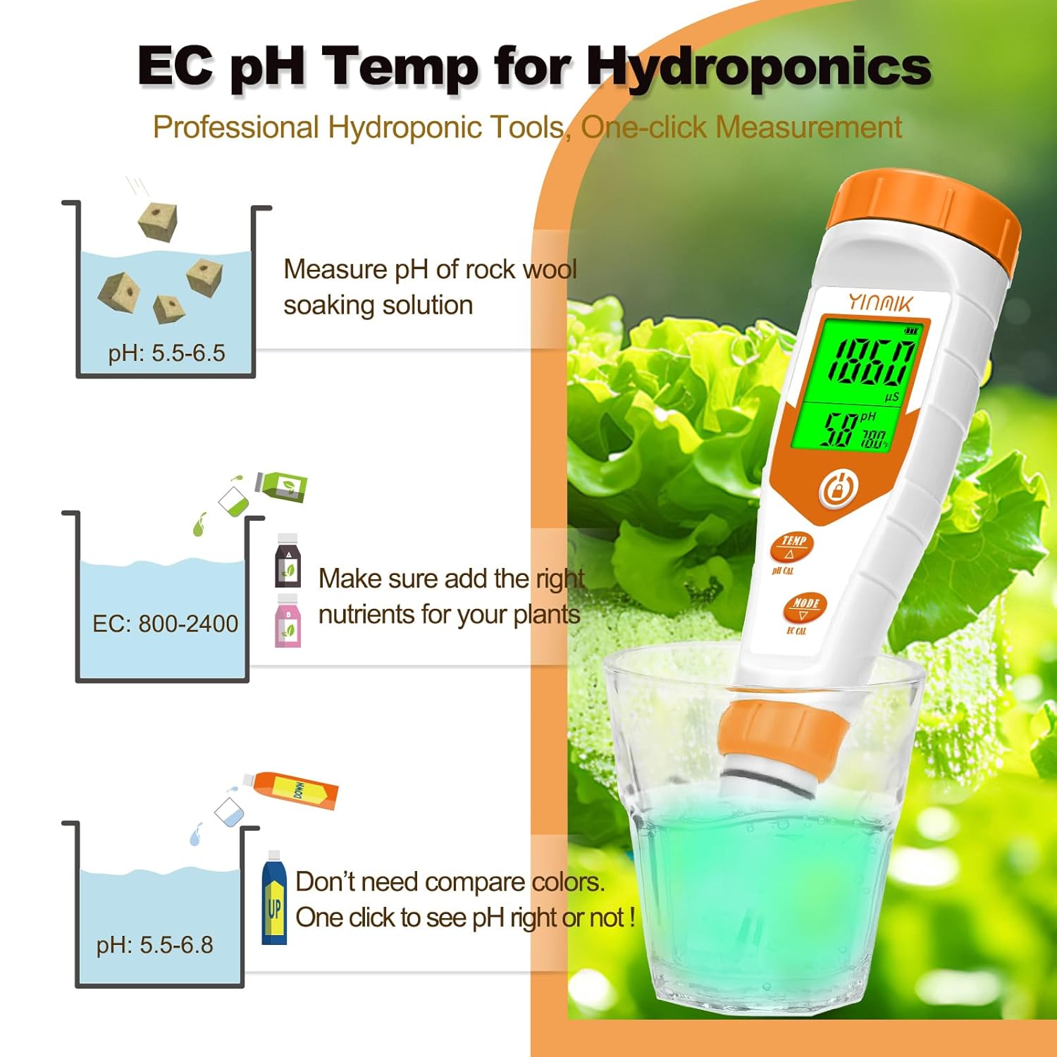 - {Simply turn on meter to get the PH EC Temperature value } YINMIK's newly upgraded 4-in-1 pH EC tester is specially upgraded for hydroponic growers. It can continuously monitor pH, EC and temperature values of the hydroponic nutrient solution on the screen at the same time without switching buttons. YINMIK pH meter helps you know when to add nutrient solution and when to add pH UP DOWN solution to adjust pH, cooperate with your hydroponic system, and ensure the healthy growth of your plants