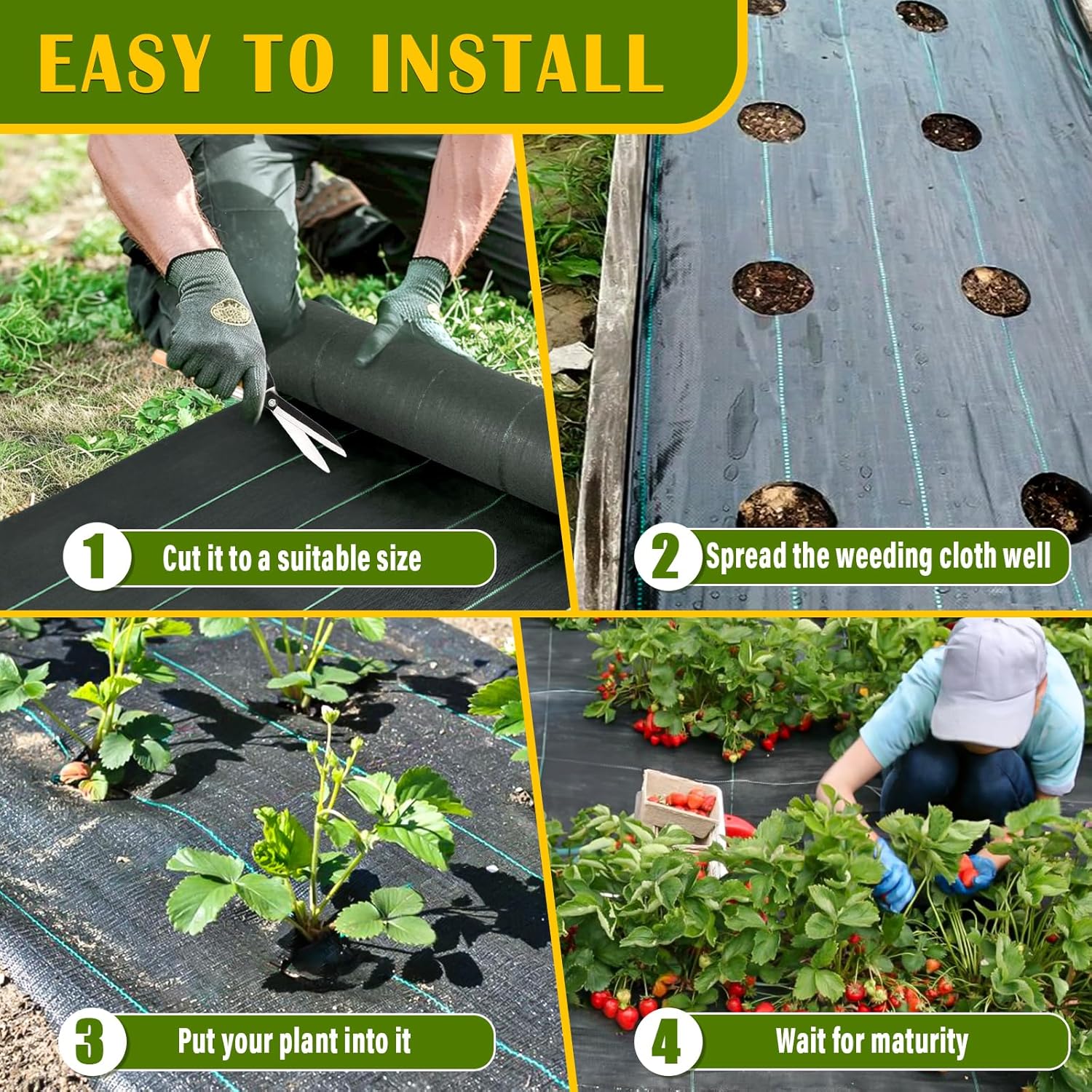 - Weed control fabric features: This heavy-duty weed barrier measures 4ft x 300ft and is easy to cut.This ground cover weed barrier is convenient for DIY projects, allowing you to customize the size and shape to meet your specific needs. The garden cloth weed barrier features green stripes for easy plant alignment. This lightweight ground cover fabric is easy to move around and cut holes in, yet tough enough not to tear