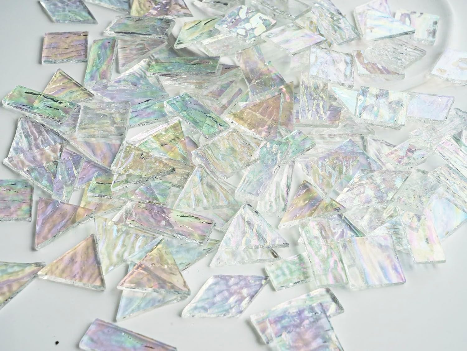 Iridescent Textured Cathedral Glass Mosaic Tiles, 200g Transparent Stained Glass Pieces for Mosaic Art, Pre-Cut for Handmade Crafts, Clear