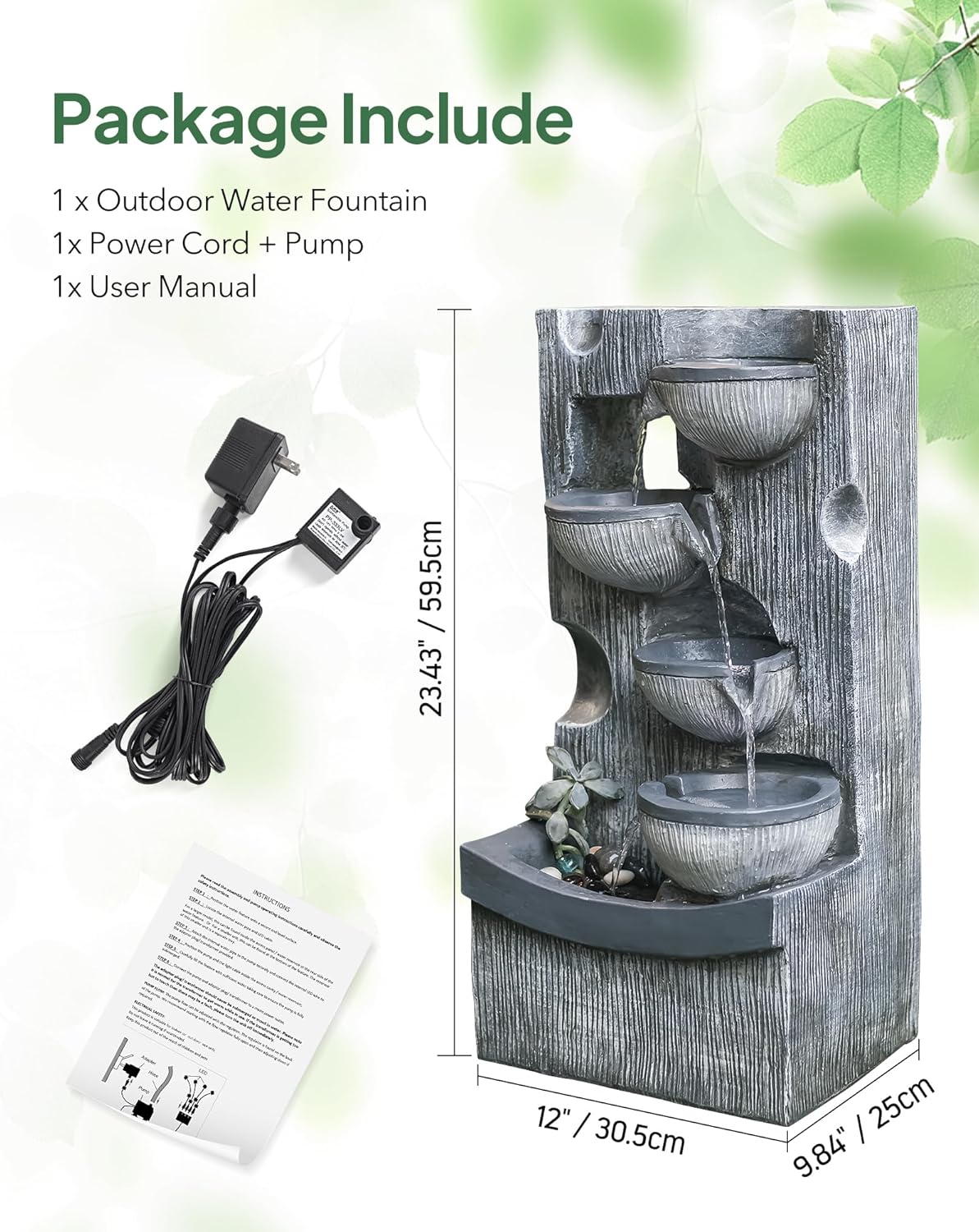 - 【Soothing Water Flow】 The water flow of this modern fountain flows from the four-tier bowl to the bottom, creating a sound similar to a real waterfall fountains that instantly relaxes you. Additionally, our pump has been upgraded, allowing you to adjust the water flow rate based on the desired sound.