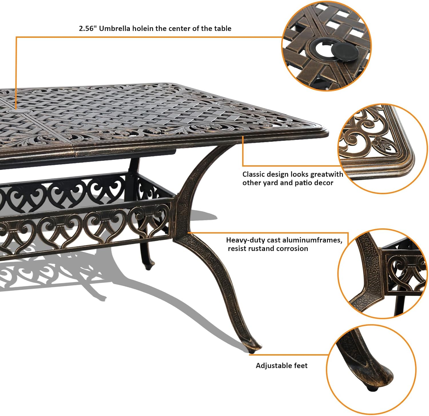 Rectangle Patio Table 59" Cast Aluminum Patio Dining Table with 2.56" Umbrella Hole, Weather-Resistant Outdoor Dining Table for 6-8 Person, Balcony Garden Table 59" x 35.5" x 29", Bronze