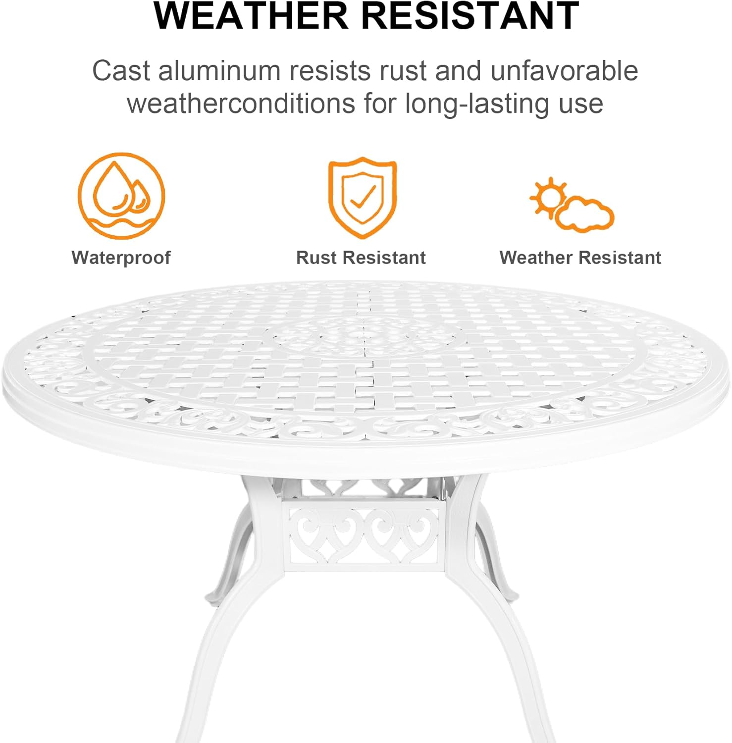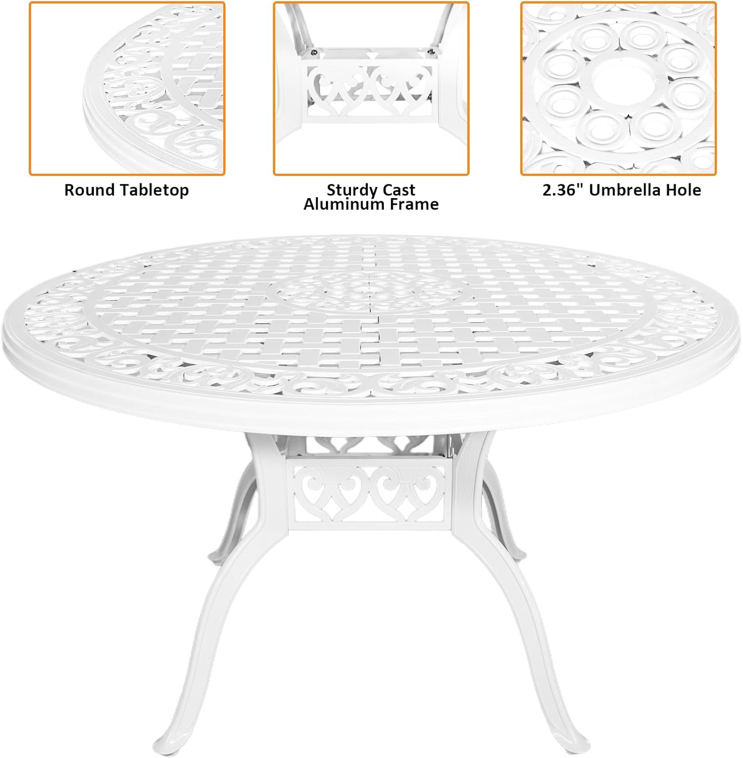 48 Inch Outdoor Dining Table Round Patio Bistro Table Powder-Coated Cast Aluminum Frame Patio Dining Table Garden Table with Umbrella Hole (White)