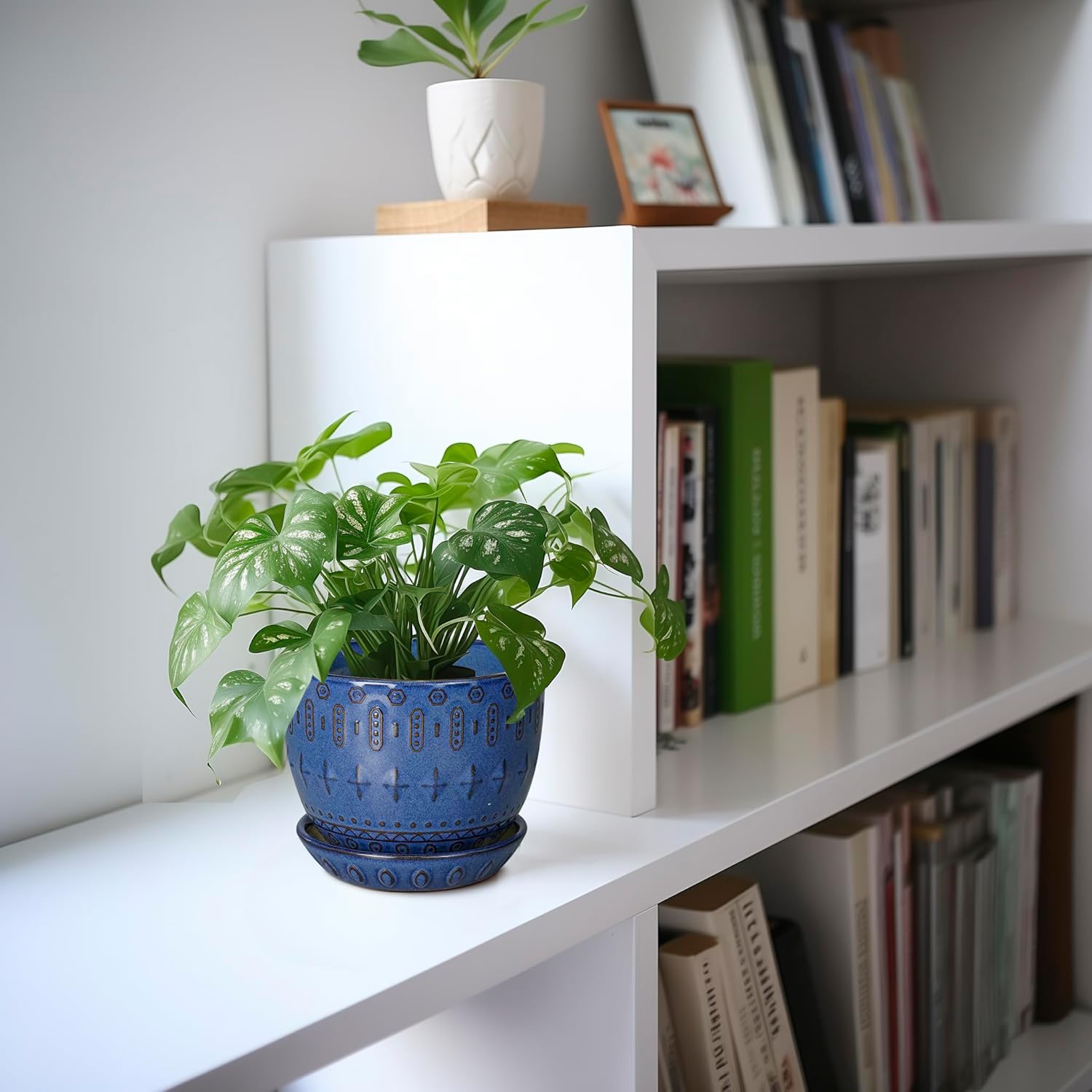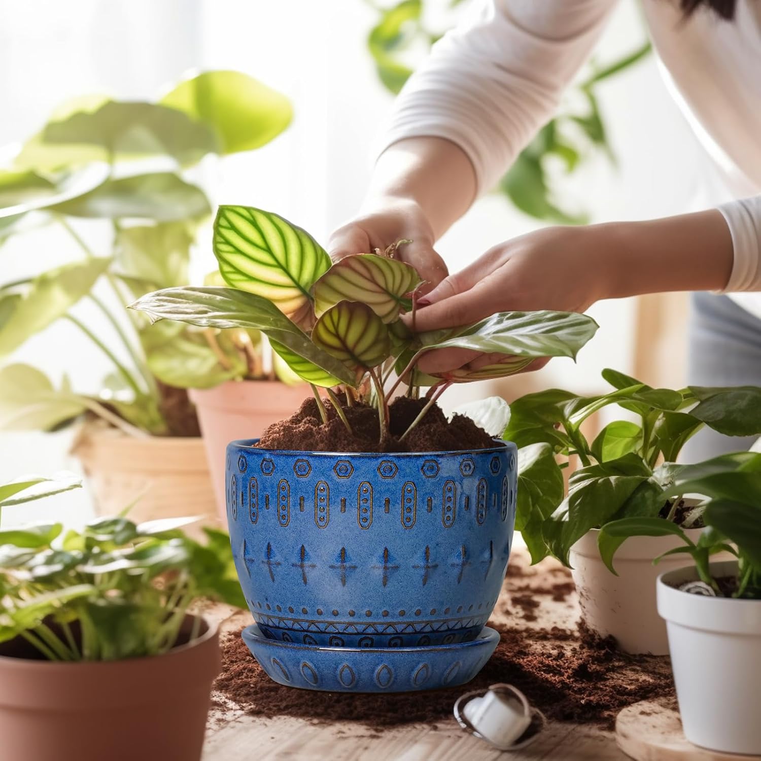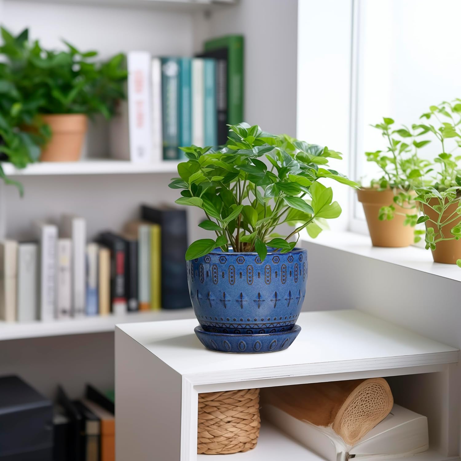 G EPGardening Plant Pot 5 Inch - Ceramic Planter for Indoor Plants Outdoor, Succulent Orchid Pot with Drainage Hole and Saucer, Round Flower Pot for Home Decor, Blue