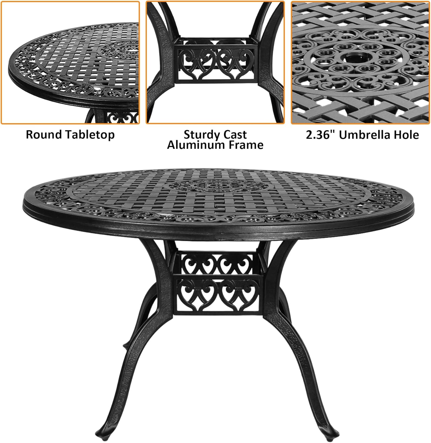 Cast Aluminum Patio Table,48" Round Patio Dining Table for 4-6 Person with Umbrella Hole,Metal Patio Table Outdoor Round Bistro Dining Table for Garden,Yard,Black