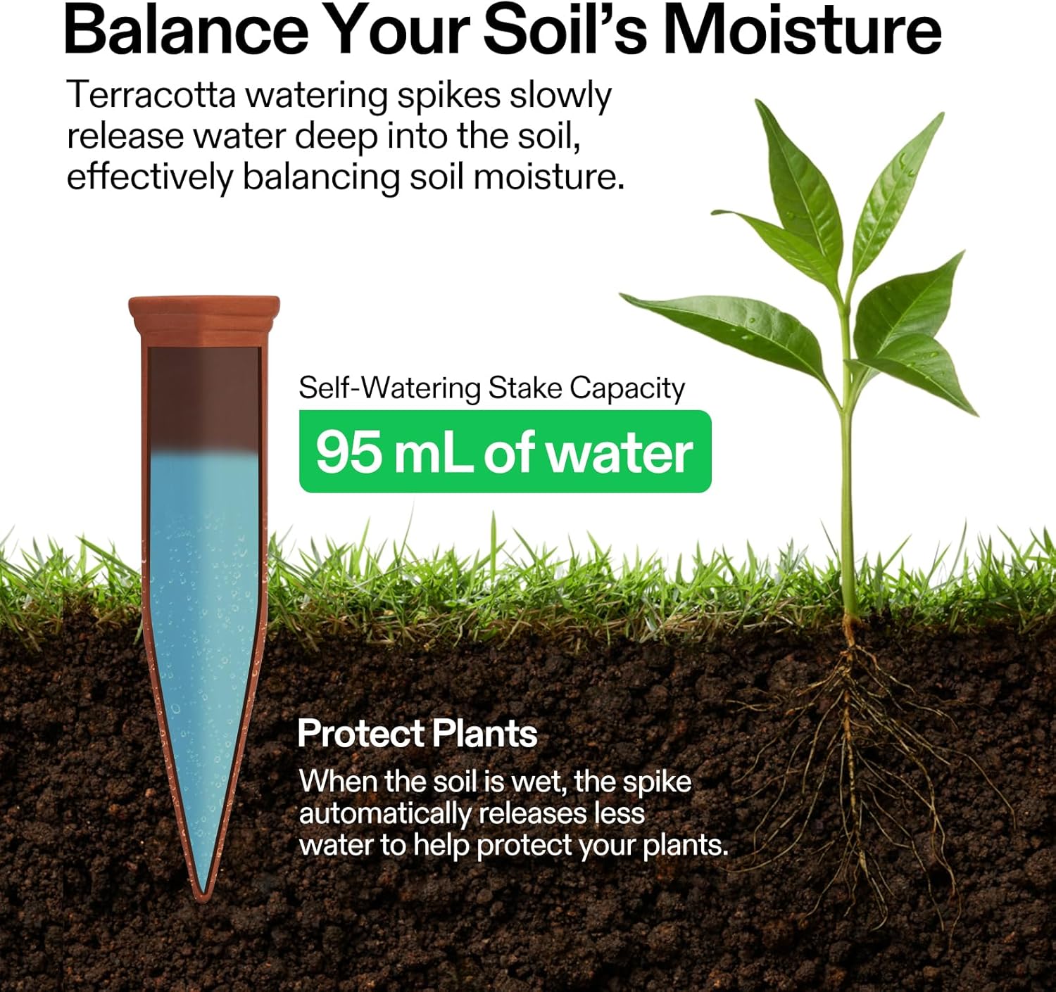 - Balanced Soil Moisture: These terracotta watering spikes slowly release water deep into the soil, maintaining consistent moisture; They adjust automatically, releasing less water when the soil is moist to protect your plants