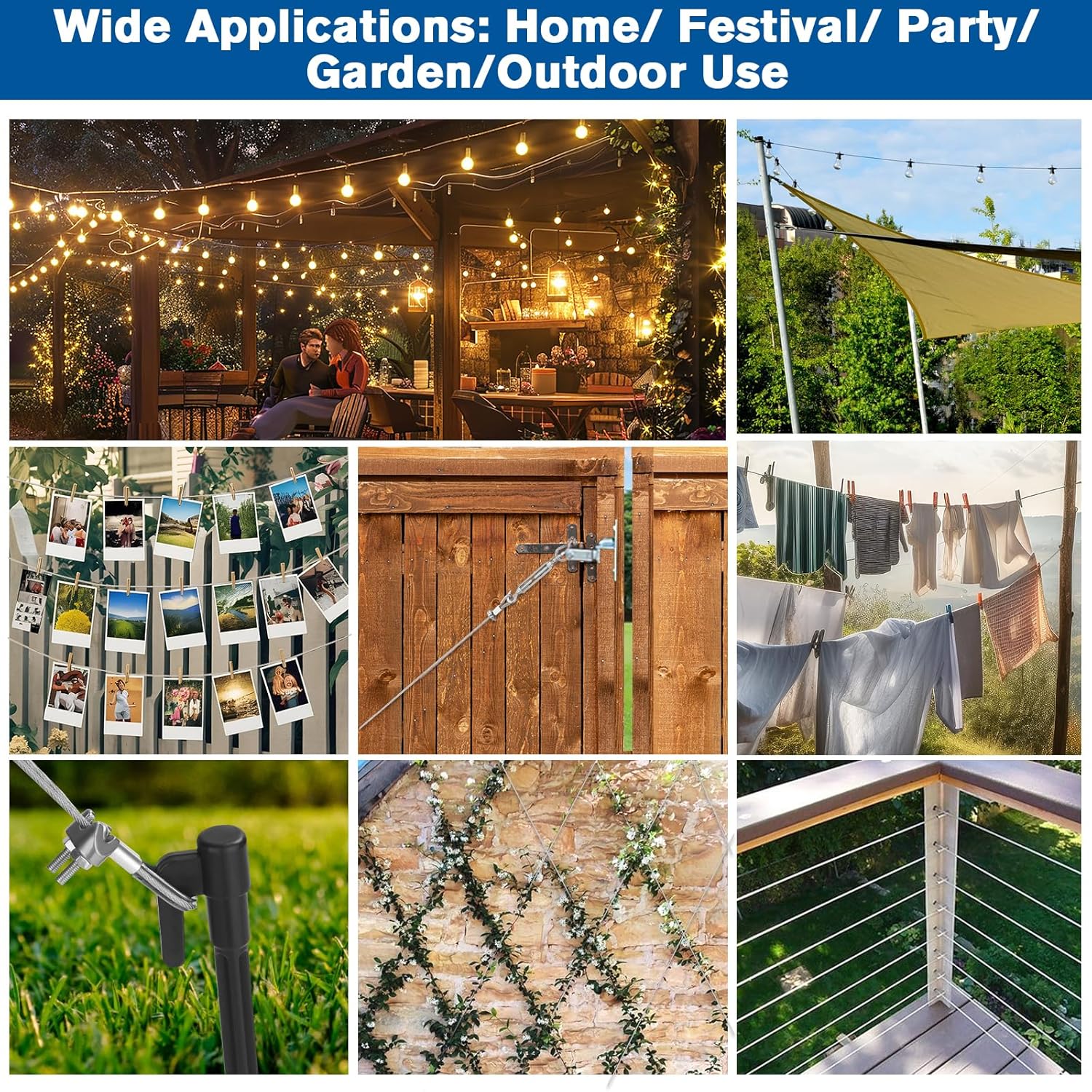 - 【Wide Applications】: Our vinyl coated steel cable is perfect for indoor and outdoor use, which can be used in multiple ways such as hanging string lights for a romantic party, patio, backyard, garden and porch. Besides, the guy wire kit also can be used for picture hanging wire, sun shade hardware kit, curtain wire hanging system, cable railing, clothes line cable, garden wire trellis and more hanging need