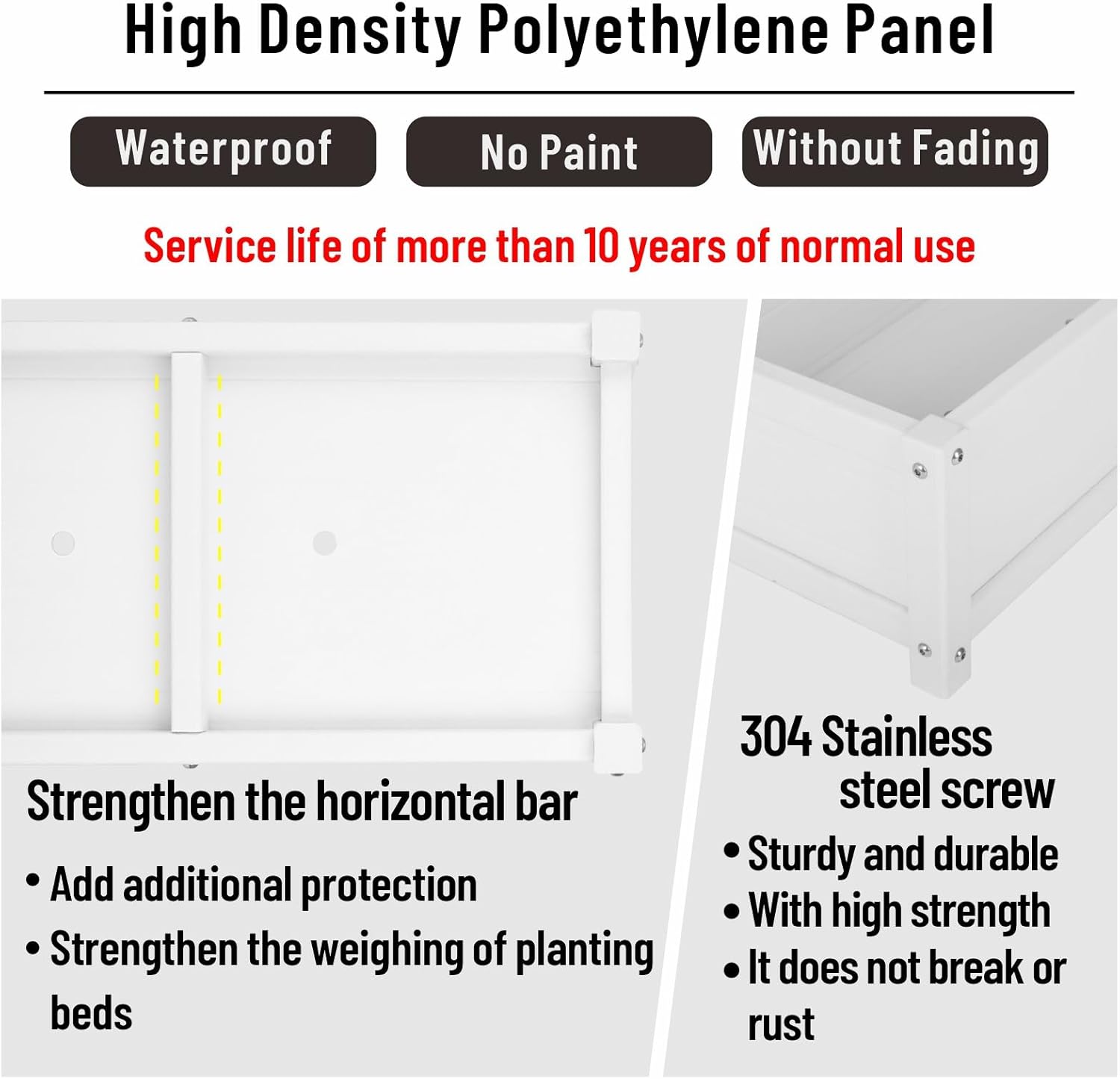 - Safety:Raised planter box outdoor made from HDPE,with no water or oil-based coatings, ensuring that your fruits, vegetables, plants, and herbs grow safely