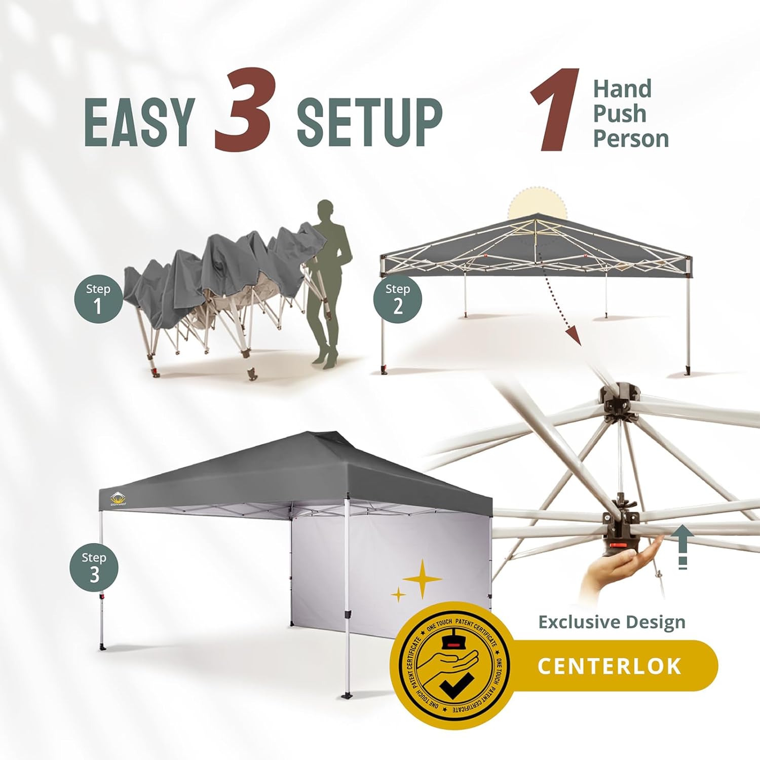- ONE BUTTON EASY SET UP - Our canopy tent features patented one push center lock technology. With just a single push, the central hub locks all four legs in place. Use the soft pinch-free buttons to easily adjust the leg height. Designed for the next generation, this canopy can be set up by two people in seconds without any tools. Three adjustable height settings ensure convenience and safety, making it perfect for camping, beach outings, craft fairs, tailgating, farmer markets, and more.