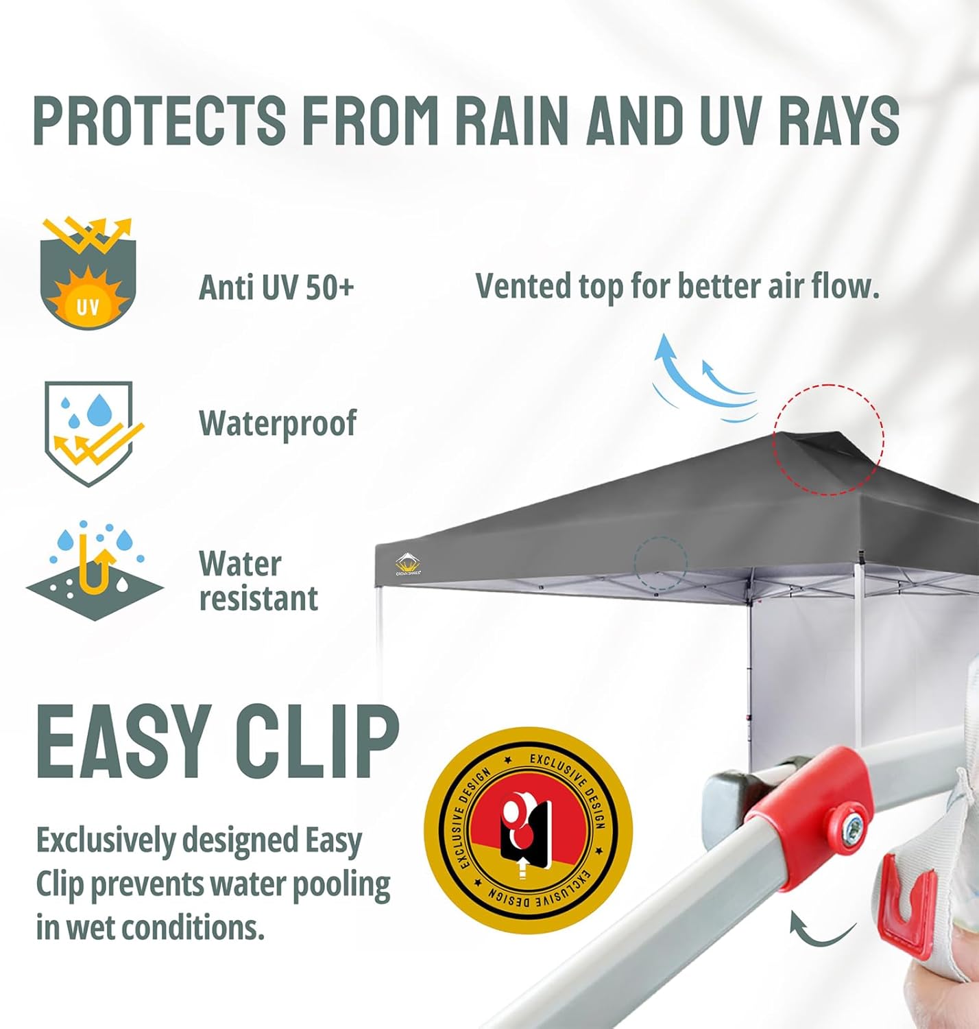 - EZ CLIP CANOPY FABRIC - The newly designed clip system makes it easy to attach the canopy fabric to the frame. The silver-coated interior provides exceptional UPF 50+ UV protection, ensuring cooler, safer shade. Made from rugged 150D fabric, the canopy is water-resistant and CPAI-84-rated for flame resistance. The canopy features integrated air vents, and the EZ clip system prevents wind lift and rain pooling, reducing fabric tearing risks. Ideal for outdoor events, weddings, and gatherings.