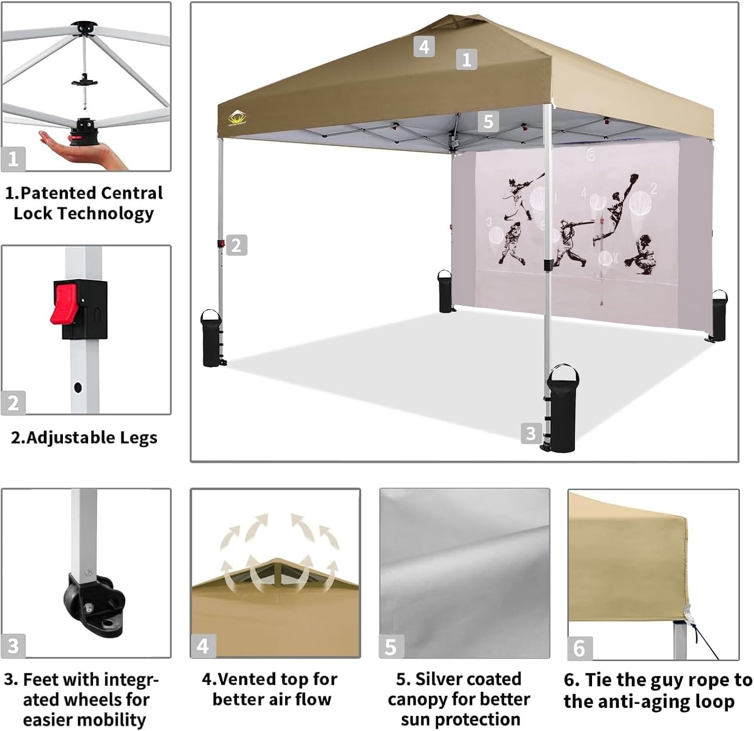 - ONE BUTTON EASY SET UP - Our 10x10 pop up canopy tent features patented one push center lock tech. With just a single push, the central hub locks the poles in place. Designed for the next generation, this outdoor canopy for patio can be set up by two people in seconds without any tools. Three adjustable height settings with soft, pinch-free buttons ensure convenience and safety, making it perfect for camping, beach outings, craft fairs, tailgating, farmer markets, outdoor BBQs, and more