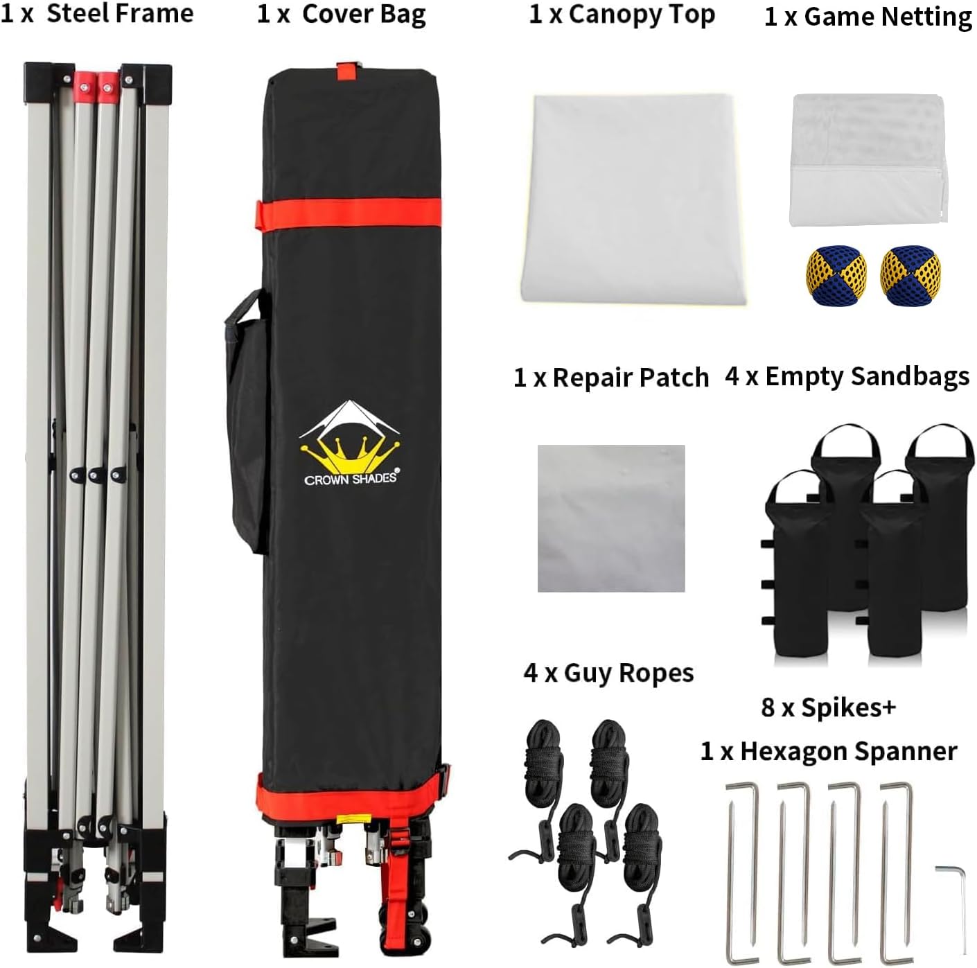 CROWN SHADES 10x10 Pop Up Canopy Tent with Game Netting - Beach Tent with One Push Setup - Outdoor Sun Shade for Events, Parties, Camping with STO-N-Go Cover Bag, Silver Coated Top, White