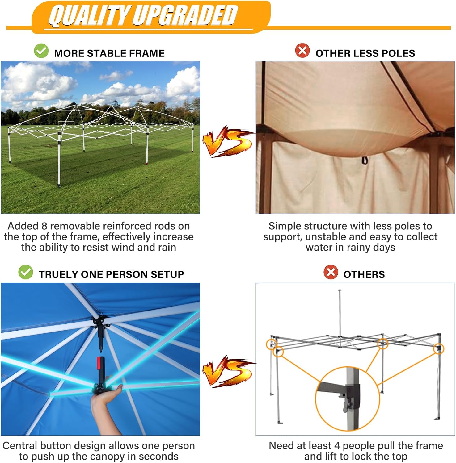 - OPTIMIZED FOR STABILITY: Our canopy tent with sidewalls is crafted from durable powder-coated steel pipes and equipped with 8 detachable poles for exceptional top support. Easy up canopy remains steady even in windy and rainy conditions.