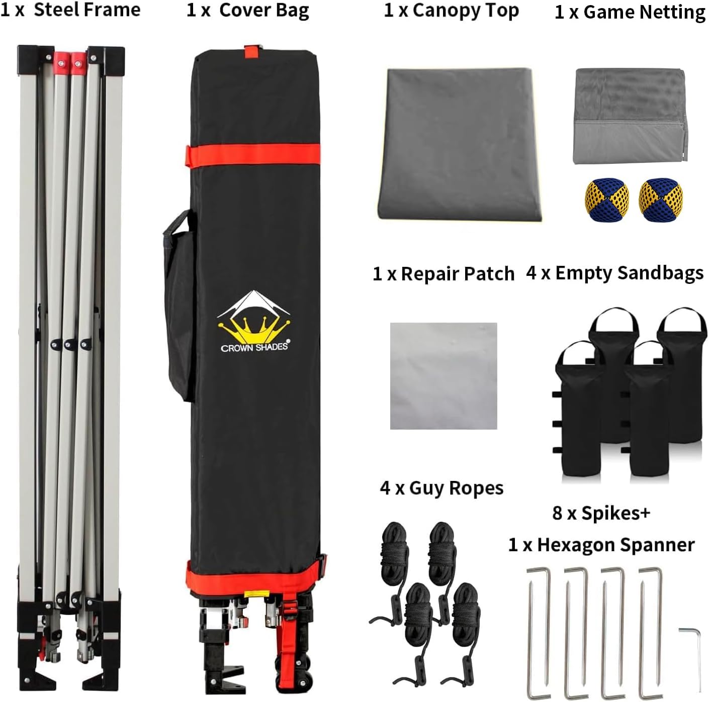 CROWN SHADES 10x10 Pop Up Canopy Tent with Game Netting - Beach Tent with One Push Setup - Outdoor Sun Shade for Events, Parties, Camping with STO-N-Go Cover Bag, Silver Coated Top, Grid Grey