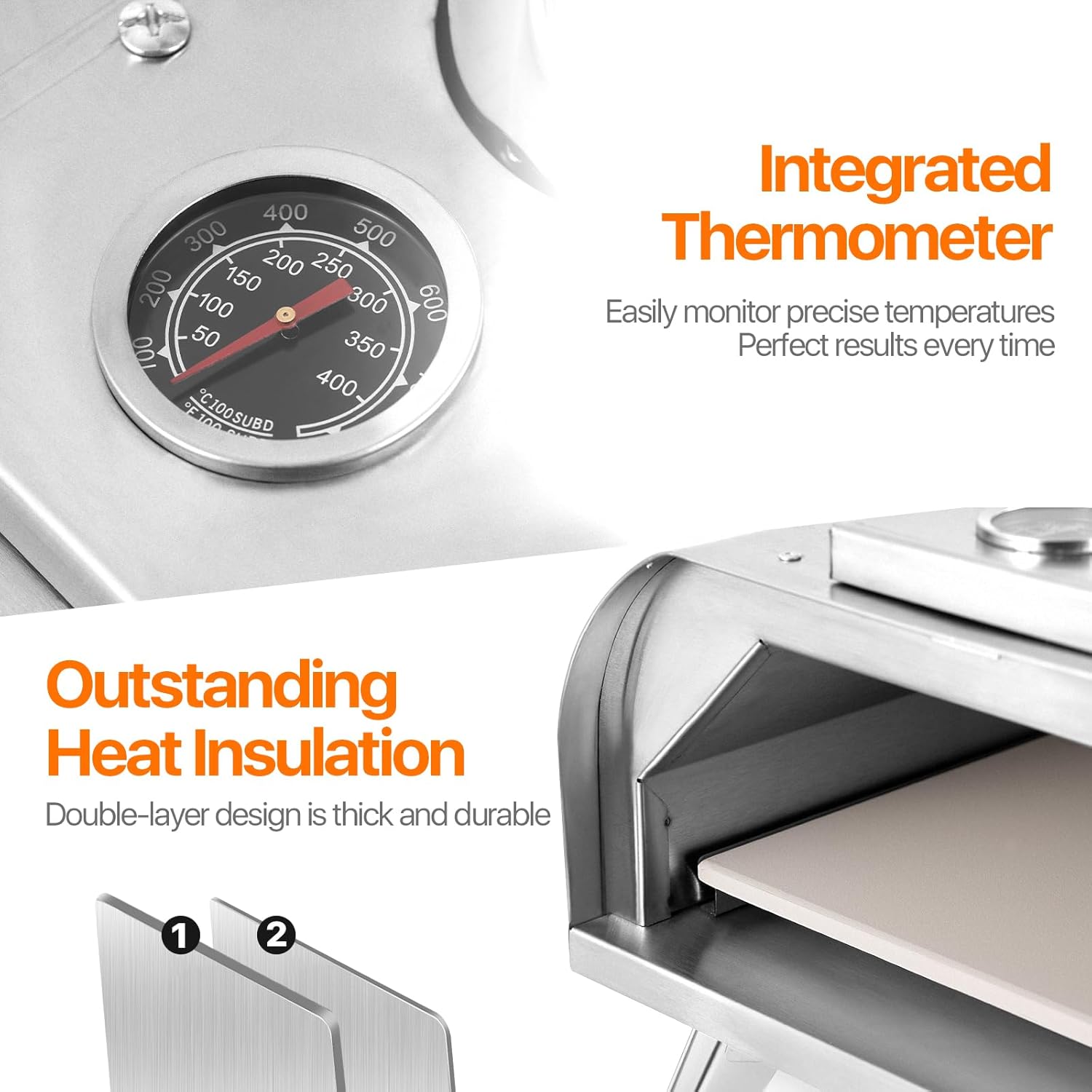 - Done in Minutes: Our outdoor pizza oven has a built-in thermometer so you can easily monitor the temperature inside the oven to track cooking progress. Heats up to 752°F in just 15 minutes and reaches a maximum temperature of 1,022°F. When preheated, the 13'' cordierite pizza stone bakes pizzas to crispy perfection in 90 seconds or less, as well as steaks, fish, lamb chops, burgers, salmon, vegetables and more
