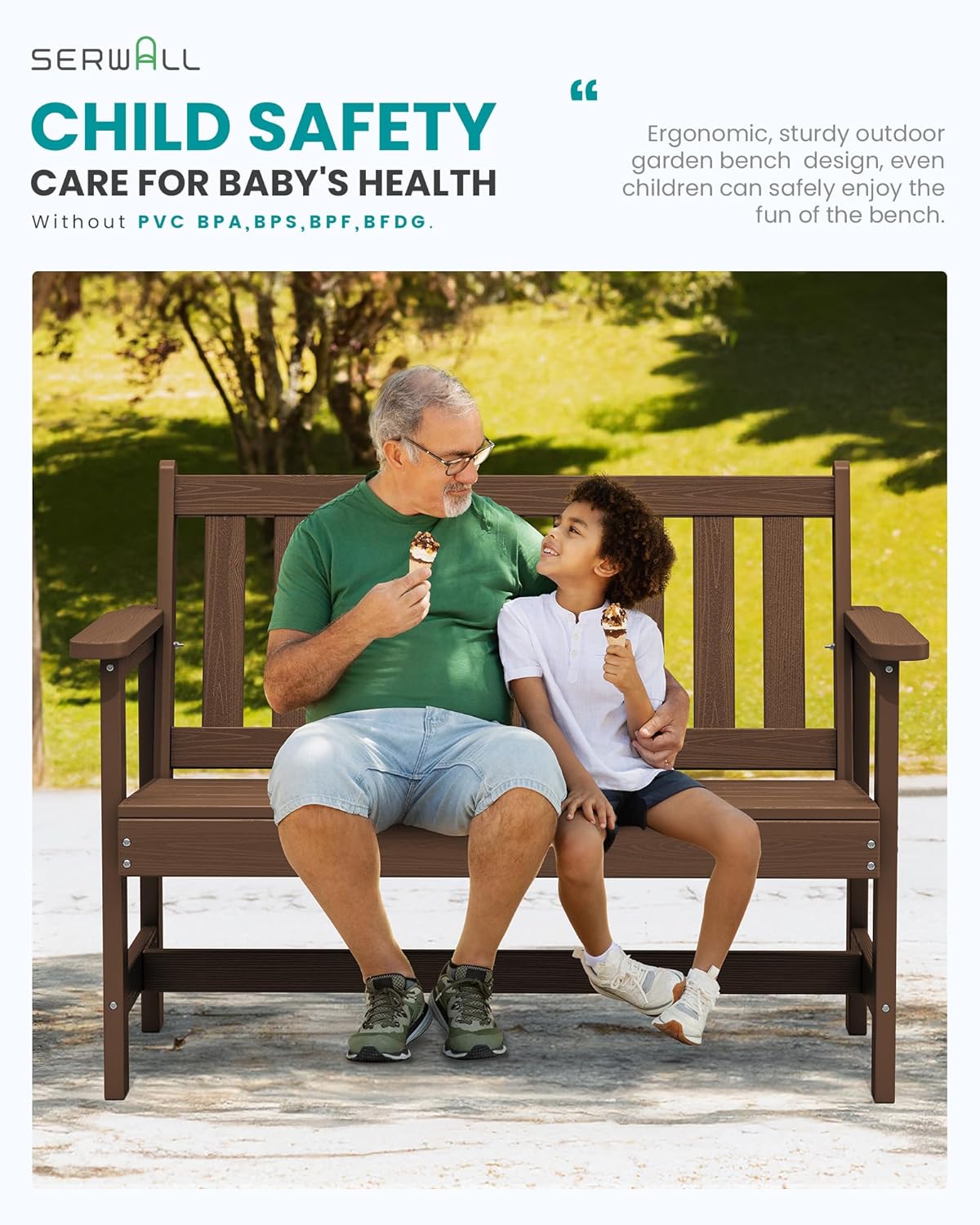SERWALL Outdoor Bench, HDPE Outdoor Benches Weatherproof, 2-Person Garden Bench with 660 lbs Weight Capacity, Patio Benches for Outdoors, Garden, Porch, Backyard and Park, Brown