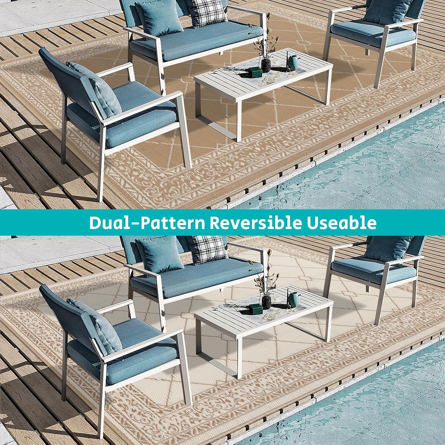 • Reversible Outdoor Rugs: Featuring a classic moroccan pattern on both sides, this 8x10 ft outdoor area rug allows you to instantly refresh your patio, porch, backyard, deck, RV campsite. And this outdoor deck rug is reversible, two-sided design allows you to have two different looks,both sides can blend perfectly with nature and look very full and comfortable.