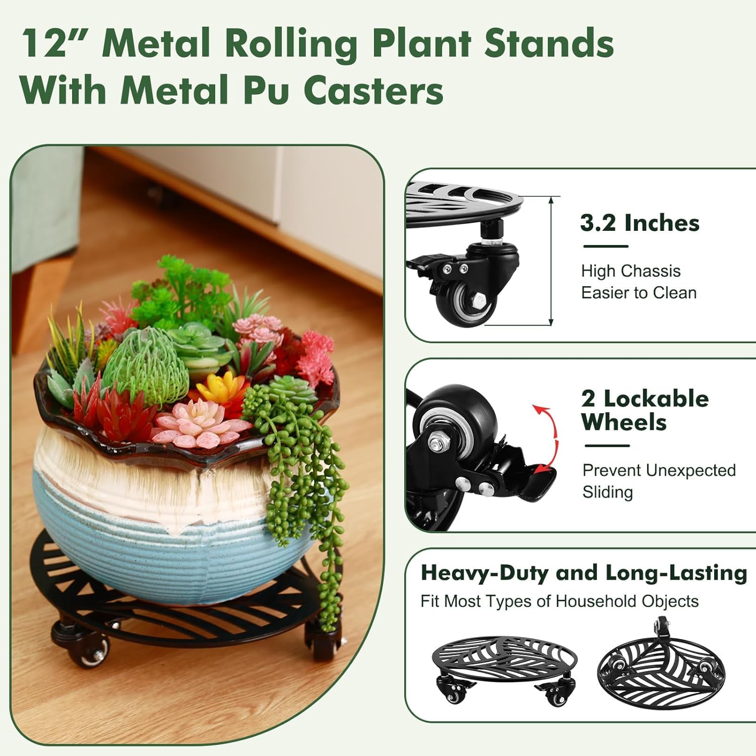 - Unique Design: The package will come to you with 3 packs of 12” metal plant caddy, which is special designed like leaf pattern. It holds the heavy plant pots while add an addition to your home decor.