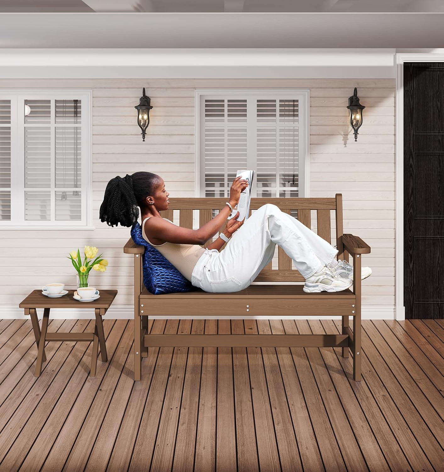 - Low Maintenance: The high-density polyethylene (HDPE) material of the porch bench requires minimal maintenance. Simply wipe with a cloth or rinse with water to keep it clean, ensuring the poly outdoor bench remains aesthetically pleasing for a long time.