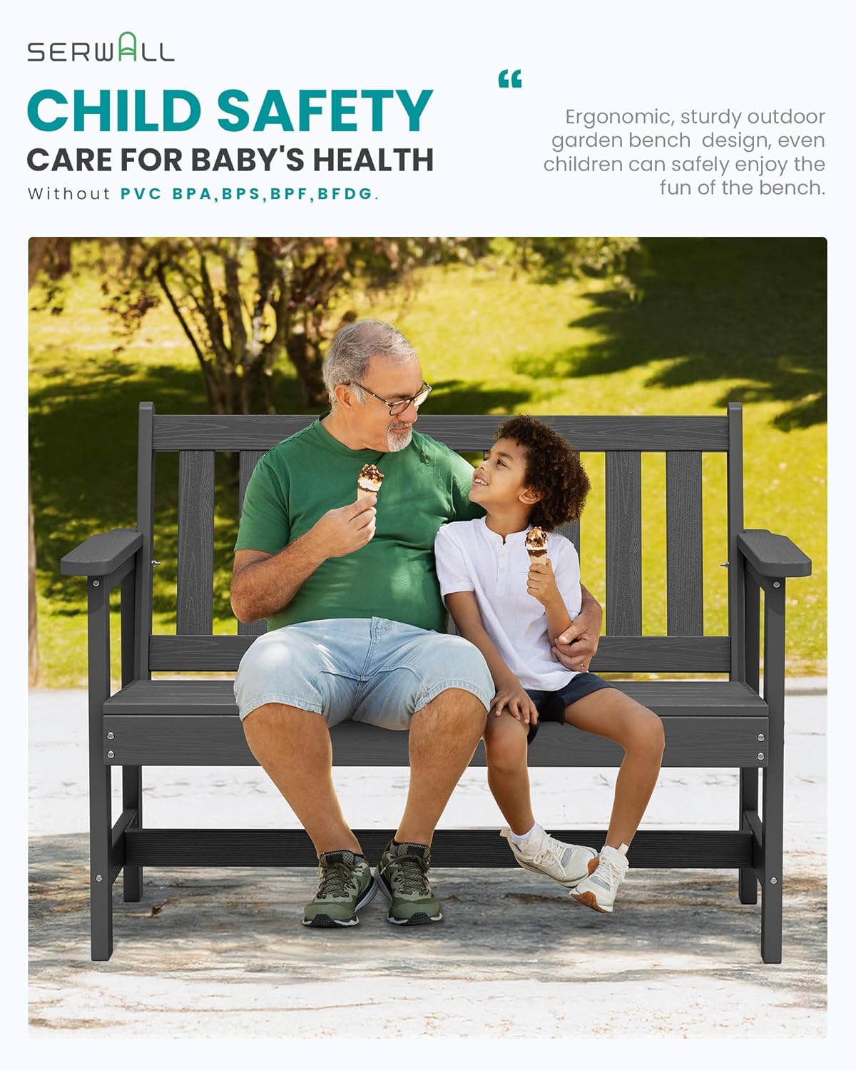 - All-Weather Resistant: The SERWALL garden bench is made of durable high-density polyethylene (HDPE), along with 304 stainless steel hardware, making it resistant to various weather conditions and ensuring long-lasting durability. It is an ideal choice for any outdoor environment.