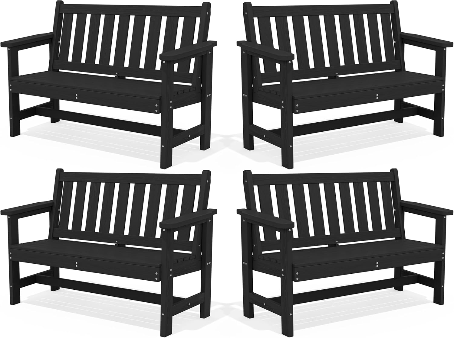 SERWALL Outdoor Bench, HDPE Outdoor Benches Weatherproof, 2-Person Garden Bench with 660 lbs Weight Capacity, Patio Benches for Outdoors, Garden, Porch, Backyard and Park, Black, 4 Pack