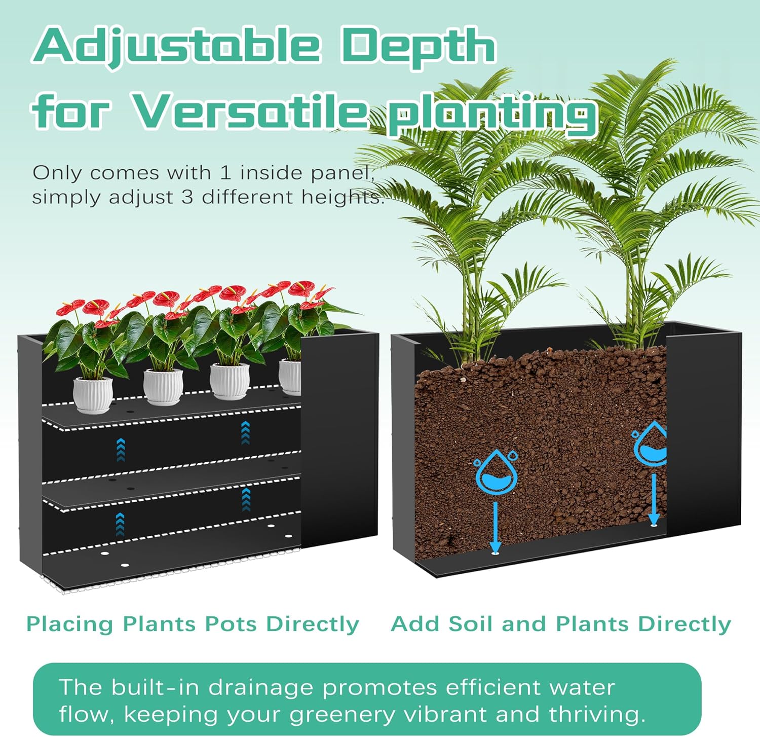- 【Customizable Height for Versatile Planting】Featuring an innovative adjustable design, this planter allows you to tailor the bottom height to suit a variety of plants. One inside panel is included to adjust 3 different heights. Whether you're growing shallow-rooted flowers or deep-rooted trees, or even using the planter to hold decorative pots, its flexibility ensures a perfect fit for your gardening needs.
