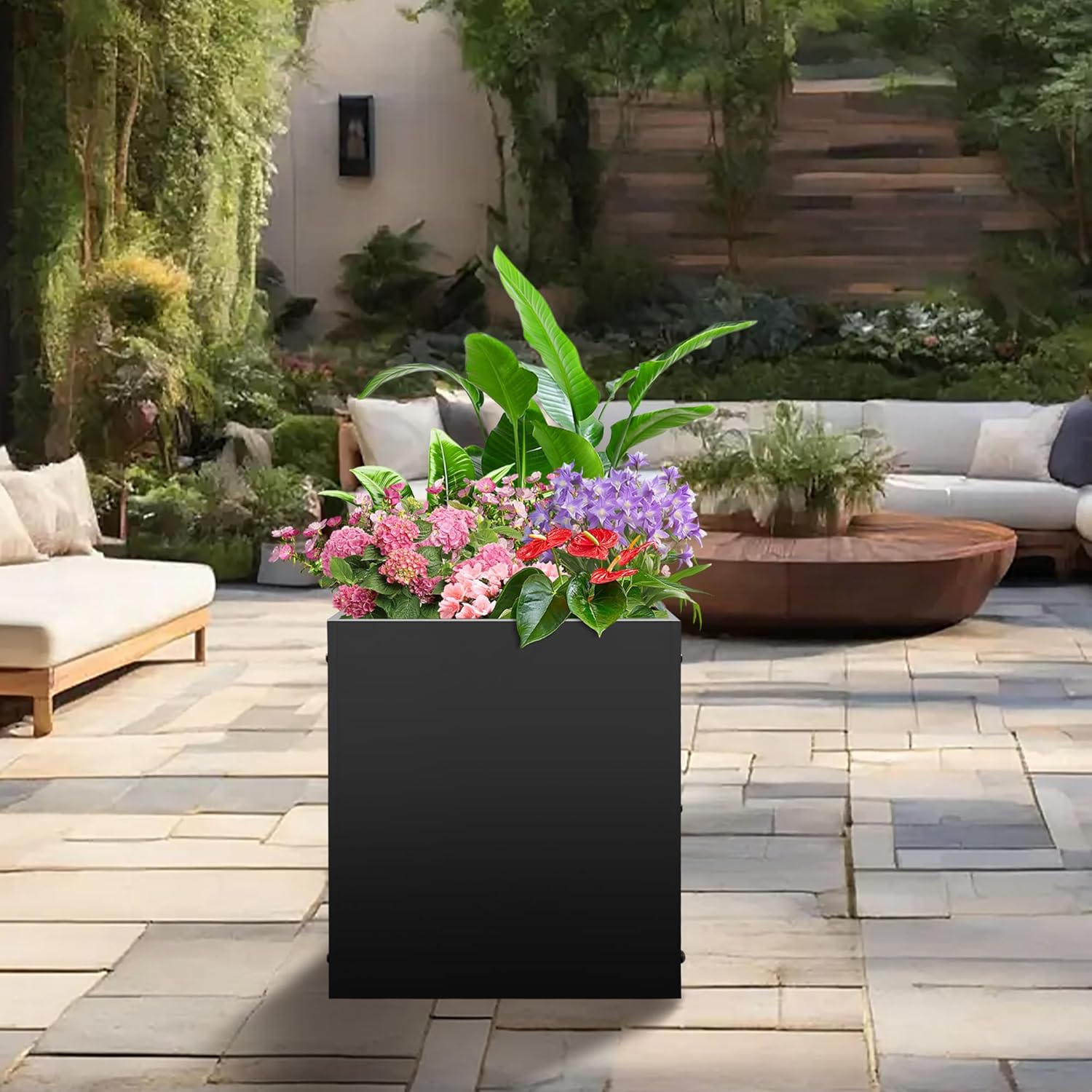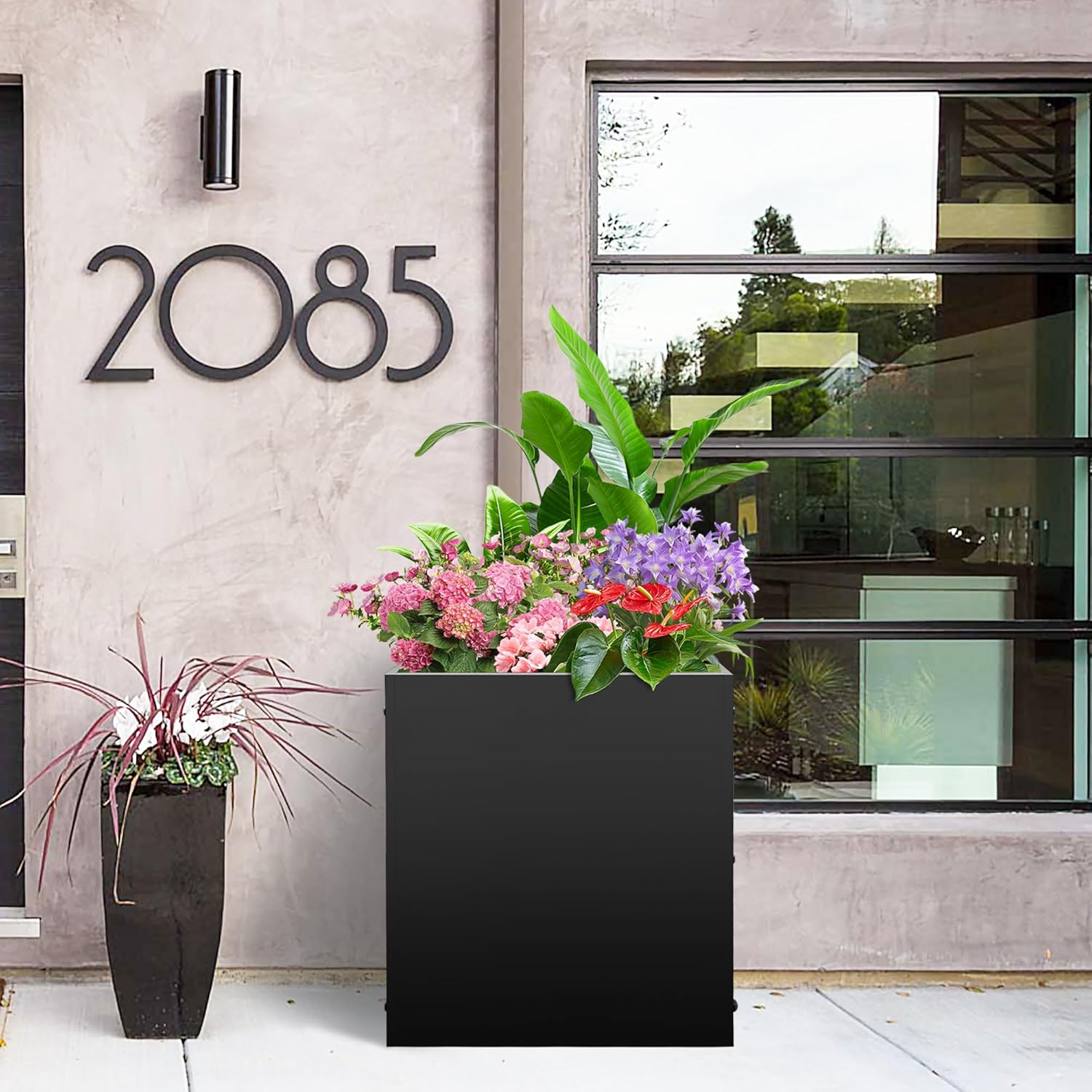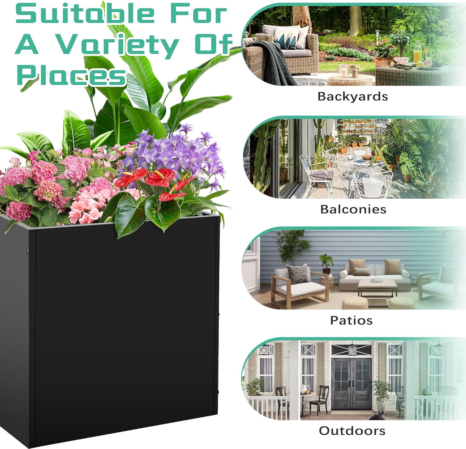 - 【Thick Galvanized Steel】Crafted from durable galvanized steel with a high-performance rust-resistant and waterproof coating, this planter box is designed to withstand harsh weather conditions and provide reliable long-term use. Its sleek matte black finish offers a modern aesthetic, effortlessly enhancing the look of your patio, balcony, or garden while blending seamlessly with any décor style.