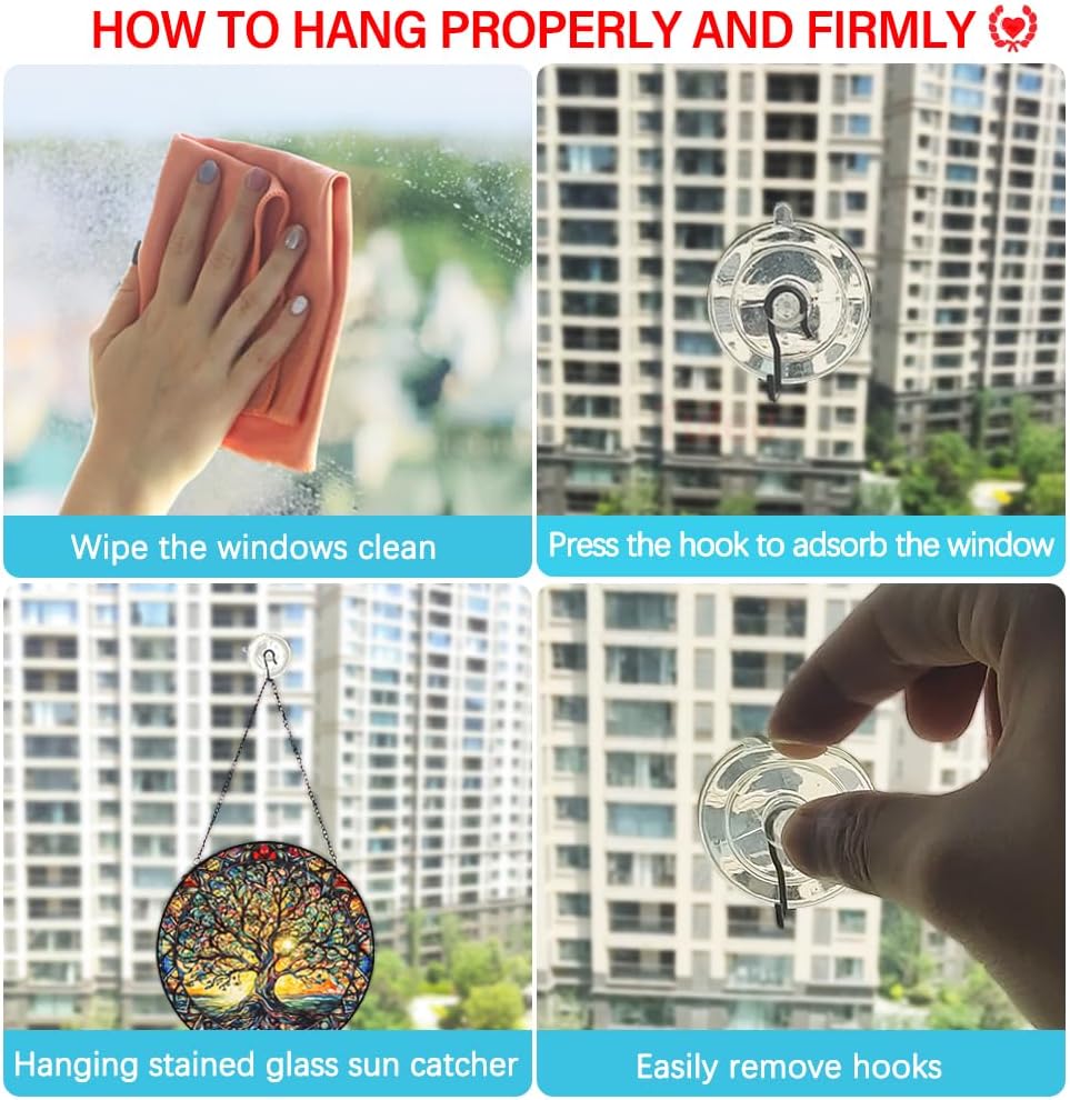 - Easy to Hang Window Suncatcher: The tree of life suncatcher garden decor package comes with a suction cup hook and easy hanging art sun catcher in indoor or outdoor occasion. The suction cup provided is an upgraded version, which is transparent almost invisable and abolutely blend our decoration style and eaily reuse in other place, it also comes with an a metal chain for quick and easy hanging
