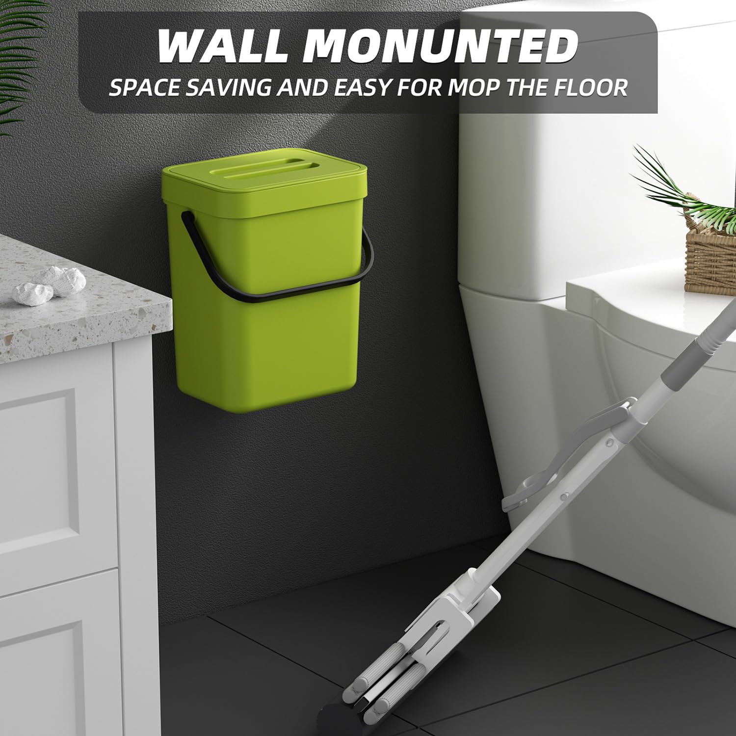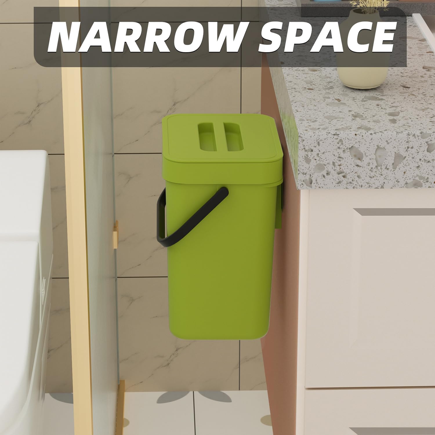 - Hanging/Wall-Mount Compost Bin Small: This hanging compost bin can be effortlessly hung on kitchen or pantry cabinet doors (ensure the door thickness is less than 0.86 inches). Additionally, the small wall mount trash can can be mounted on walls under sinks, inside cupboards, or on kitchen and bathroom walls using the included adhesive pad for easy installation