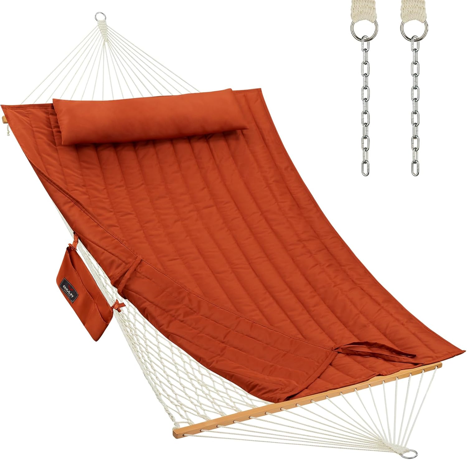 Outdoor Double Hammock with Hardwood Spreader Bars, Large Rope Hammock with Polyester Pad and Pillow, 475 LBS Capacity for 2 Person Patio Backyard Poolside - Terracotta