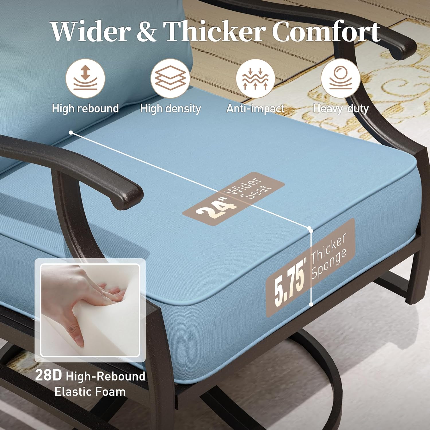 - LUXURIOUS 5.75" EXTRA THICKER CUSHION: This metal patio chairs comes with a 5.75-inch extra thick soft cushion filled with 28D density sponge with high resilience for comfortable sitting. Enjoy a comfortable ride even if you use it for a long time, and say goodbye to the worries of collapsing seat cushion