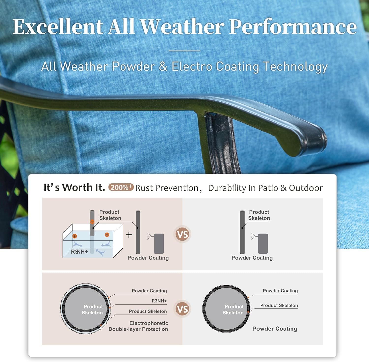 - ALL WEATHER HEAVY-DUTY FRAME: This metal outdoor sofas is made of high-performance E-COATING and POWDER-COATING dual rust prevention techniques that are All weather resistant, anti-rust, and easy to clean, with no special care needed. That patio furniture seating has a heavy-duty wrought iron metal frame. The single chairs could support up to 350 lbs weight and the 3-seater sofa supports 900 lbs.