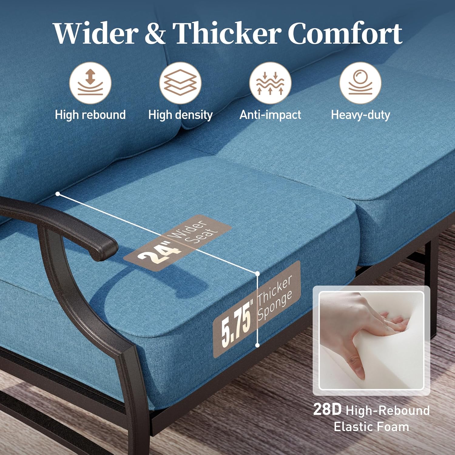- LUXURIOUS 5.75" EXTRA THICKER CUSHION: This metal patio rocker chairs comes with a 5.75-inch extra thick soft cushion filled with 28D density sponge with high resilience for comfortable sitting. Enjoy a comfortable ride even if you use it for a long time, and say goodbye to the worries of collapsing seat cushion