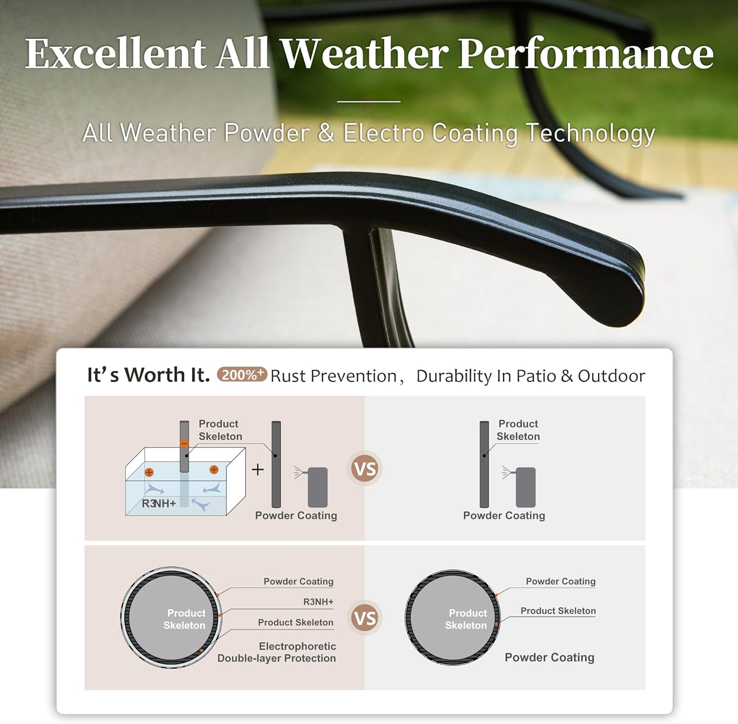 - ALL WEATHER METAL OUTDOOR PATIO CHAIRS: Our metal outdoor swivel rocker chairs focuses on providing a superior comfort experience. 31.5 Inch seating depth and 35 Inch high back design with 5.75" Inch high resilience cushions provide you with unrivalled outdoor seating relaxation experience. This outdoor furniture's diamond back design make this outdoor furniture more unique and exquisite.