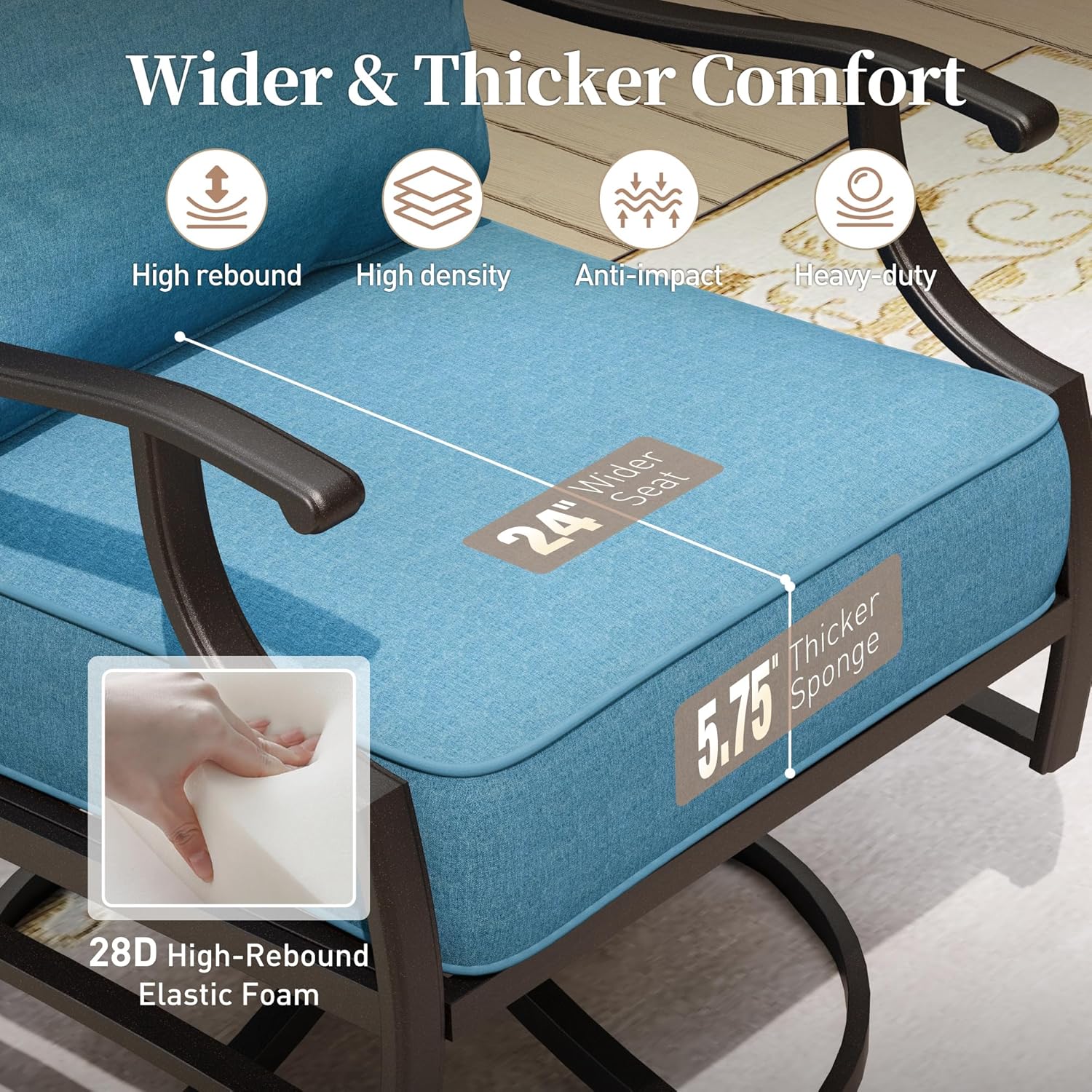 - LUXURIOUS 5.75" EXTRA THICKER CUSHION: This metal patio chairs comes with a 5.75-inch extra thick soft cushion filled with 28D density sponge with high resilience for comfortable sitting. Enjoy a comfortable ride even if you use it for a long time, and say goodbye to the worries of collapsing seat cushion