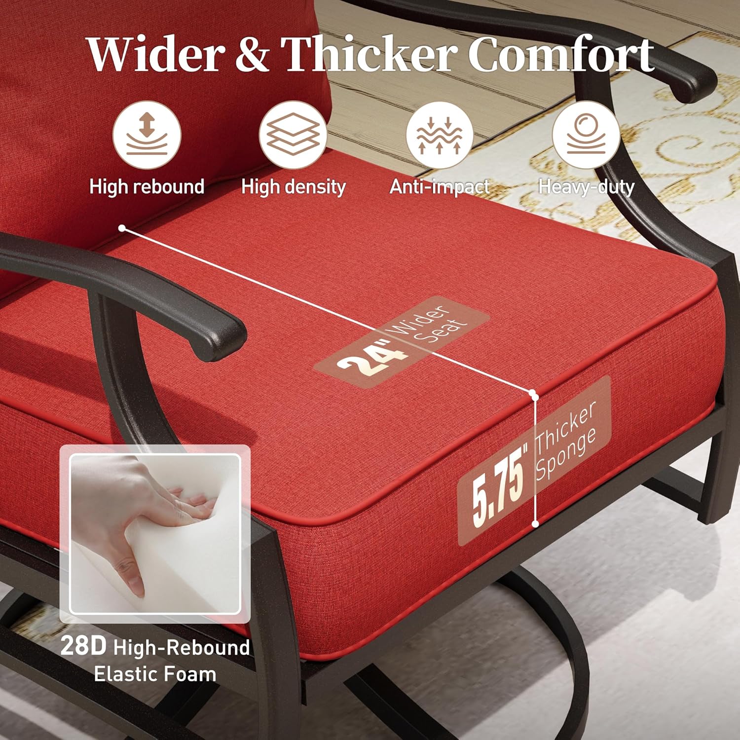 - LUXURIOUS 5.75" EXTRA THICKER CUSHION: This metal patio chairs comes with a 5.75-inch extra thick soft cushion filled with 28D density sponge with high resilience for comfortable sitting. Enjoy a comfortable ride even if you use it for a long time, and say goodbye to the worries of collapsing seat cushion