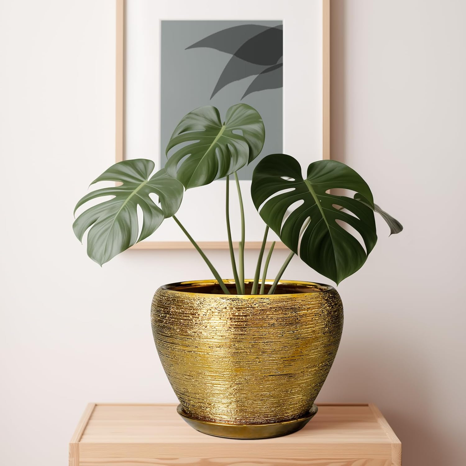 Ceramic Planter 10 Inch - Indoor Plant Pot with Drainage Hole and Saucer Large Decorative Planter Mid-Century Modern Flower Pot Outdoor for Home Decor Gold