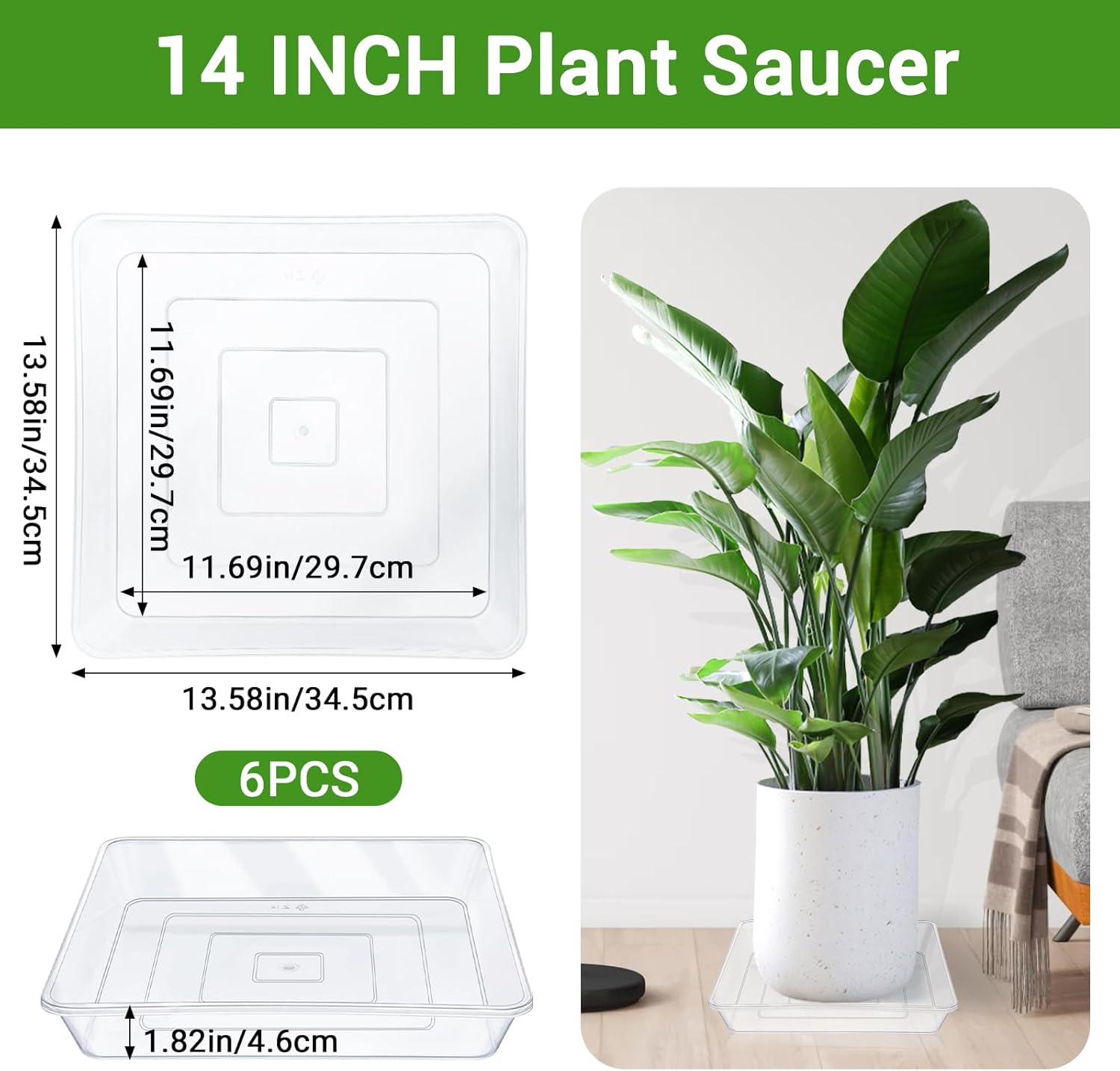 GREANER 14 Inch of Plastic Plant Saucer, 6 PCS Durable Plant Trays for Indoors, Square Plant Water Dray Tray, Plant Water Catcher Drip Dishes, Clear Drip Trays for Indoors & Outdoor Plants