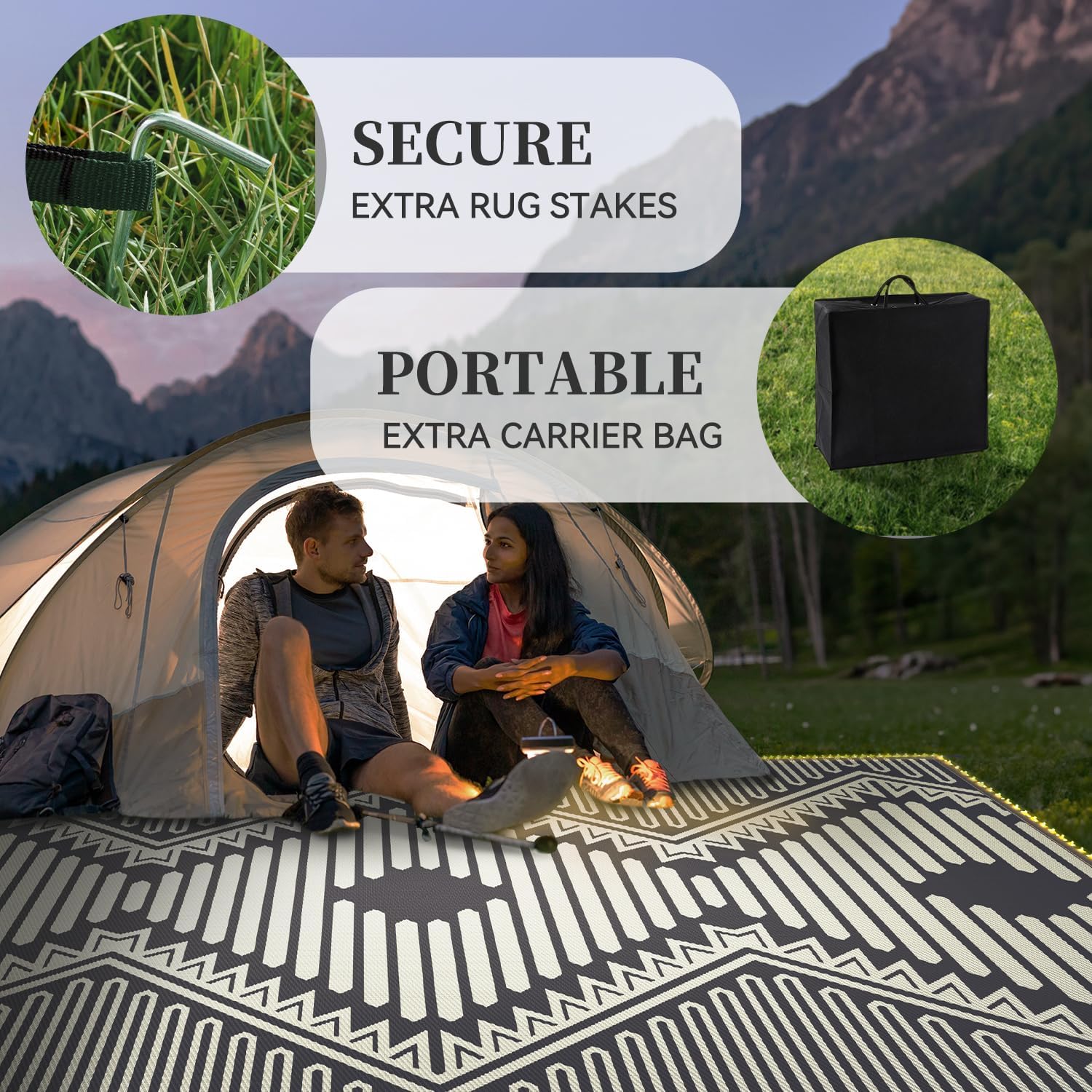 - Portable&Versatile: This lightweight large outdoor rug can be easily fold and packed into our carrier bag for outings. Extra rug stakes provide enhanced stability. They can be used as outdoor patio rugs under furniture sets, balcony rugs, pool deck rugs, porch rugs, RV outdoor rugs, outdoor camping rugs, beach mats, picnic mats.
