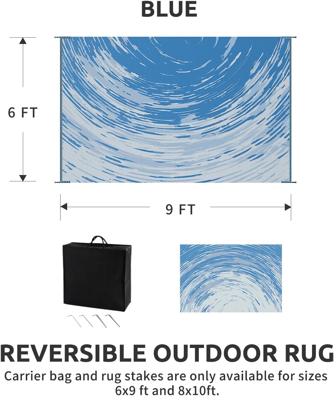 - RV traval&Camping: This camper must haves outdoor rug is ideal for picnics, gatherings, and RV trips! The lightweight outdoor camping carpet with foldable lines is easy to carry and saves space. Includes an extra carry bag and rug stakes for 6x9 ft, 8x10 ft and 9x12 ft. Grass-friendly, durable, and easy to clean, this outdoor rug enhances outdoor adventures.