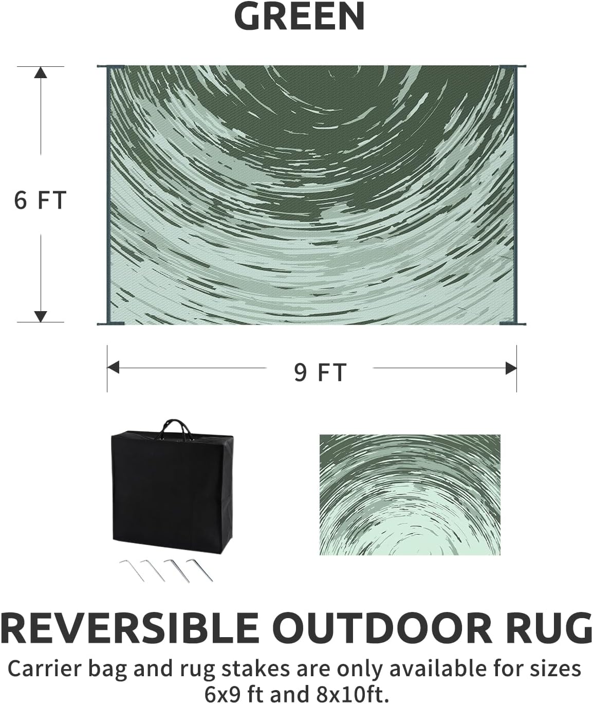 • RV traval&Camping: This camper must haves outdoor rug is ideal for picnics, gatherings, and RV trips! The lightweight outdoor camping carpet with foldable lines is easy to carry and saves space. Includes an extra carry bag and rug stakes for 6x9 ft, 8x10 ft and 9x12 ft. Grass-friendly, durable, and easy to clean, this outdoor rug enhances outdoor adventures.
