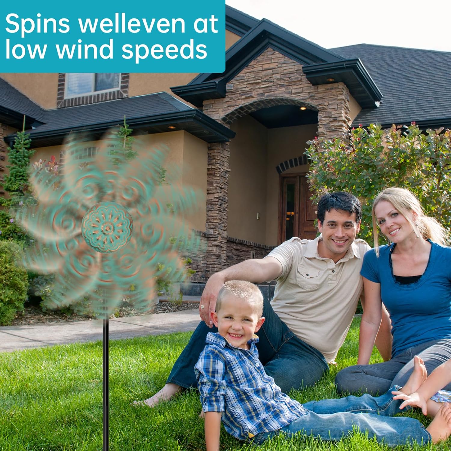 - Special shape design: Vintage design metal garden windmill,Garden spinner is painted with Green pigment , It is made of sturdy metal construction and weatherproof bronze powder coating, sturdy and durable, perfect for outdoor use as a beautiful decoration. When it starts to rotate, it will be like a flower blooming in the wind, bringing your garden to life