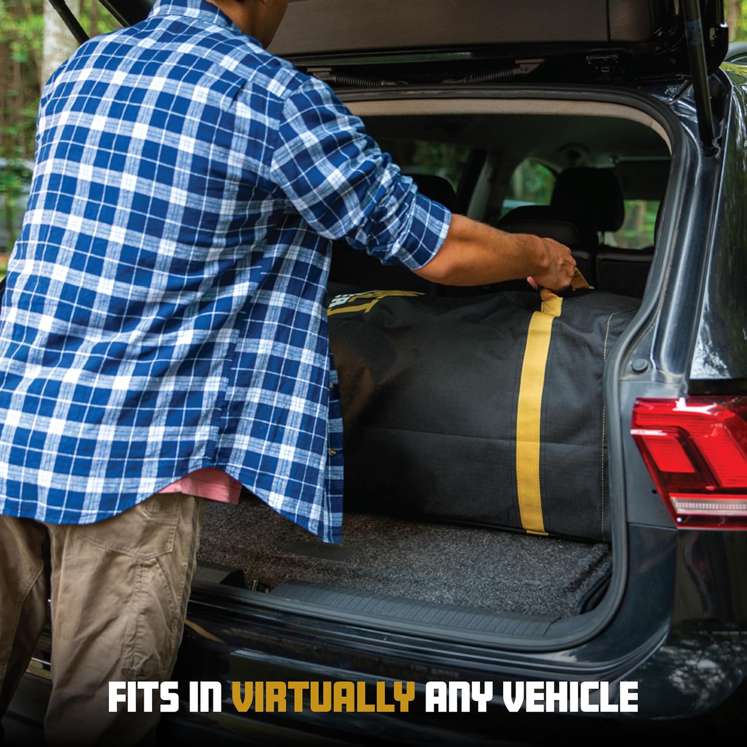 - [๐จ๐น๐๐ฟ๐ฎ-๐ฃ๐ผ๐ฟ๐๐ฎ๐ฏ๐น๐ฒ ๐๐ฒ๐๐ถ๐ด๐ป, ๐ฃ๐ฒ๐ฟ๐ณ๐ฒ๐ฐ๐ ๐ณ๐ผ๐ฟ ๐ง๐ฟ๐ฎ๐๐ฒ๐น] : Built Tough, Packed Small. Folds to 41", fitting in any vehicle, unlike larger pop up canopy options. Our weatherproof canopy comes with the Roller Wheel Bag & Tie Down Kit with heavy duty handles, storage pocket, and strong roller wheels for easy transportation and setup. The Compact Shelter can fit in most car trunks easily for your next event.