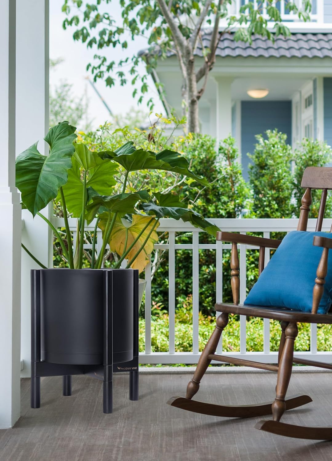 D'vine Dev Planter Pot with Stand - 12 Inch Plastic Cylinder Flower Pot with Wood Planter Holder for Indoor, Matte Black Pot + Ebony Stand, 55-C-Q-2